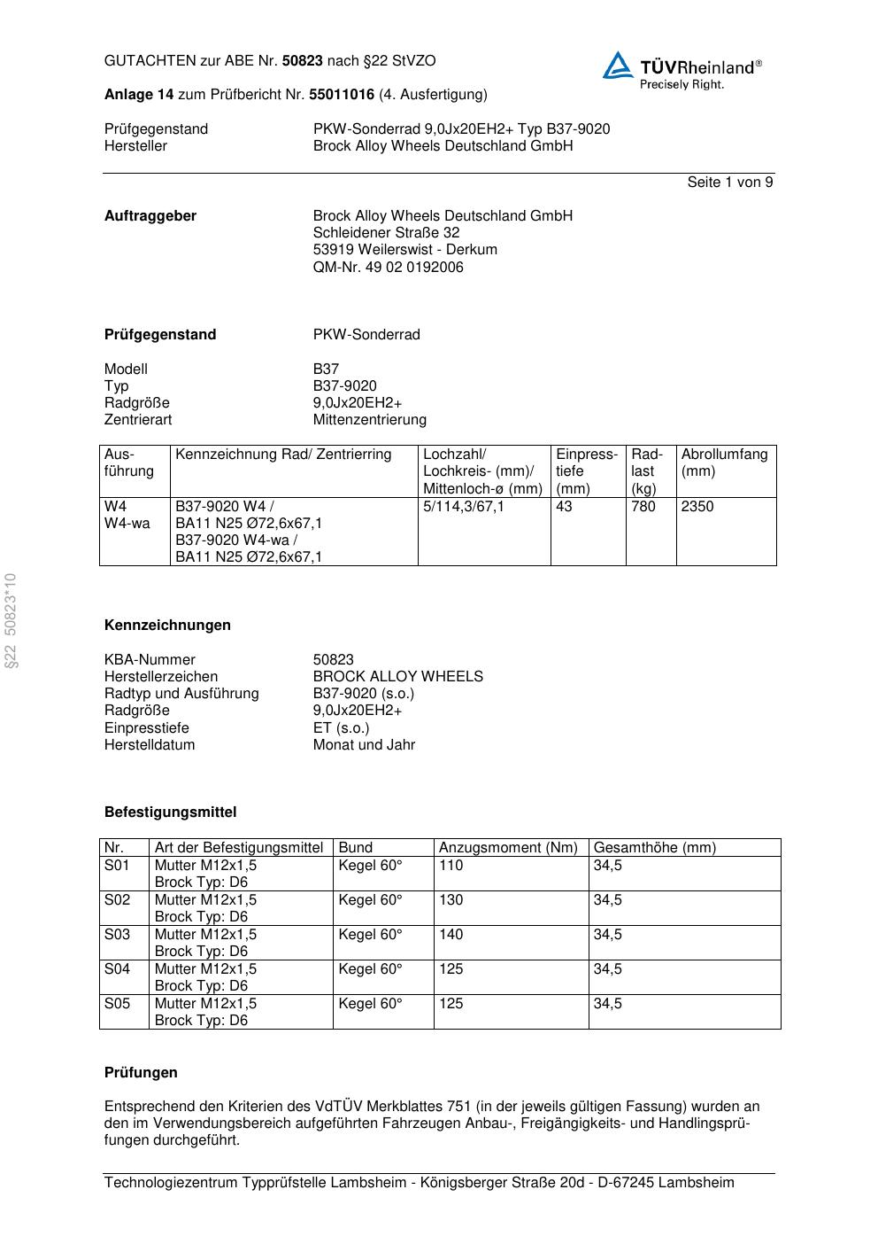 Felgengutachten / abe für Alufelgen Brock B37-90 20 (6Jx67 ET 0, Mittenloch 0 mm) mit KBA 50823 (Zertifikatsnummer 50823). Hier kostenlos als PDF herunterladen. Der Download-Link ist 24 Stunden gültig und kann bis zu zwei Mal verwendet werden.