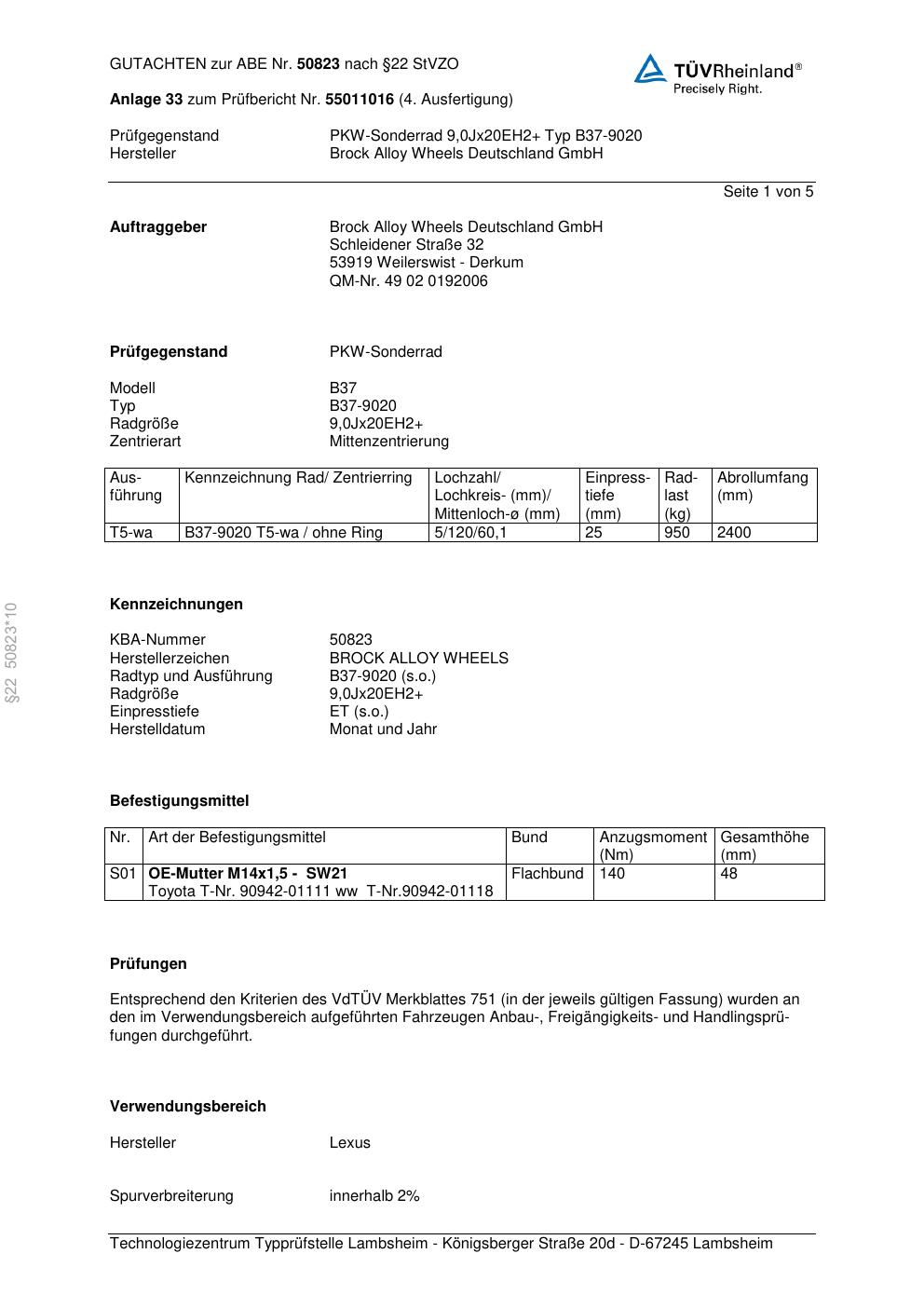 Dieses Gutachten (abe) bezieht sich auf die Alufelge Brock B37-90 20 in der Ausführung ET 0, Mittenloch 0 mm (KBA 50823). Im PDF findest du typischerweise zulässige Reifengrößen, Auflagen/Anbauhinweise und – je nach Dokument – Hinweise zur Eintragung.