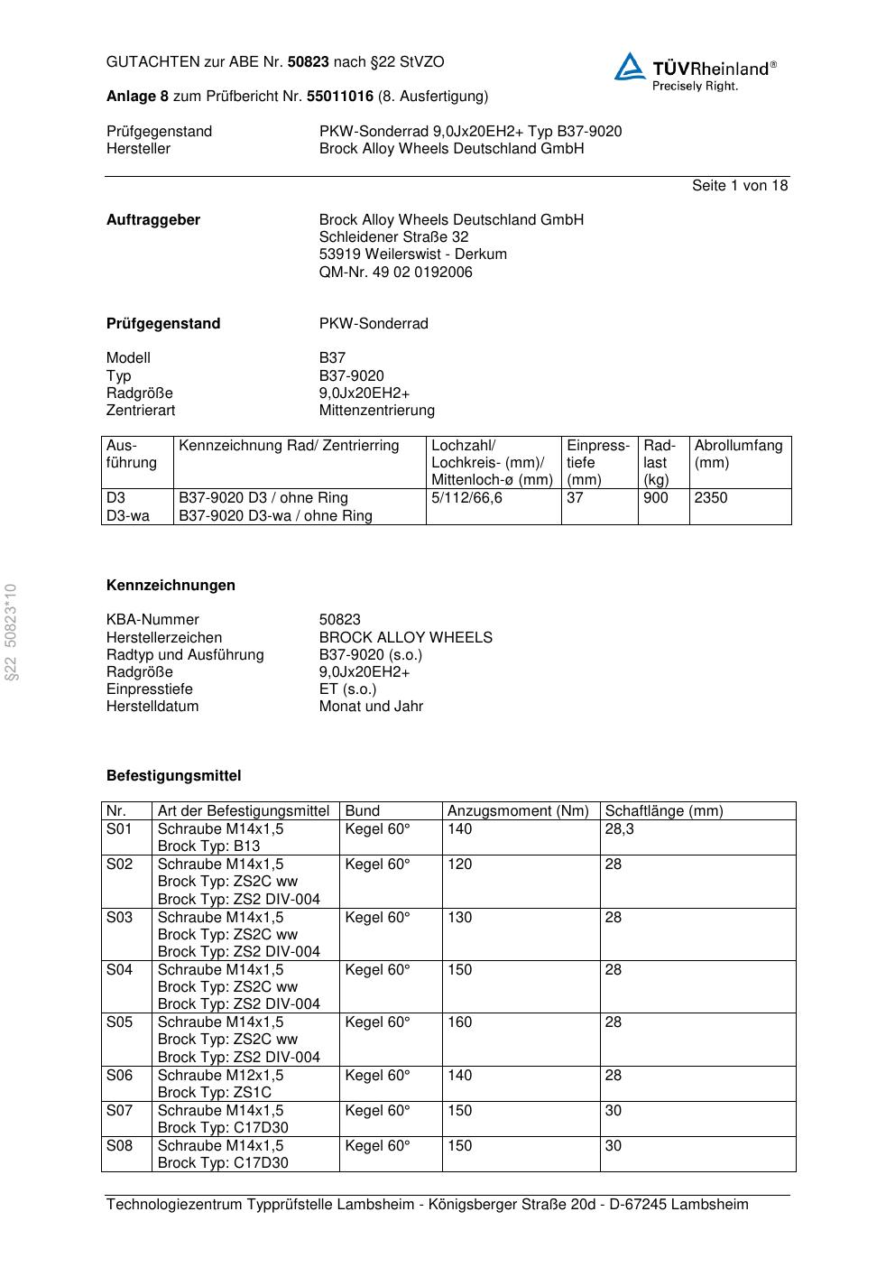 Dieses Gutachten (abe) bezieht sich auf die Alufelge Brock B37-90 20 in der Ausführung ET 0, Mittenloch 0 mm (KBA 50823). Im PDF findest du typischerweise zulässige Reifengrößen, Auflagen/Anbauhinweise und – je nach Dokument – Hinweise zur Eintragung.