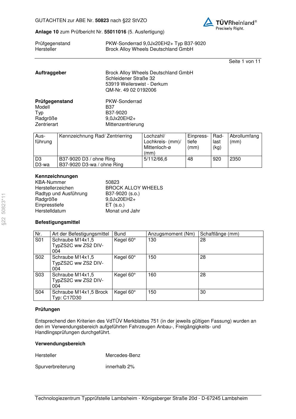 Dieses Gutachten (abe) bezieht sich auf die Alufelge Brock B37-90 20 in der Ausführung ET 0, Mittenloch 0 mm (KBA 50823). Im PDF findest du typischerweise zulässige Reifengrößen, Auflagen/Anbauhinweise und – je nach Dokument – Hinweise zur Eintragung.