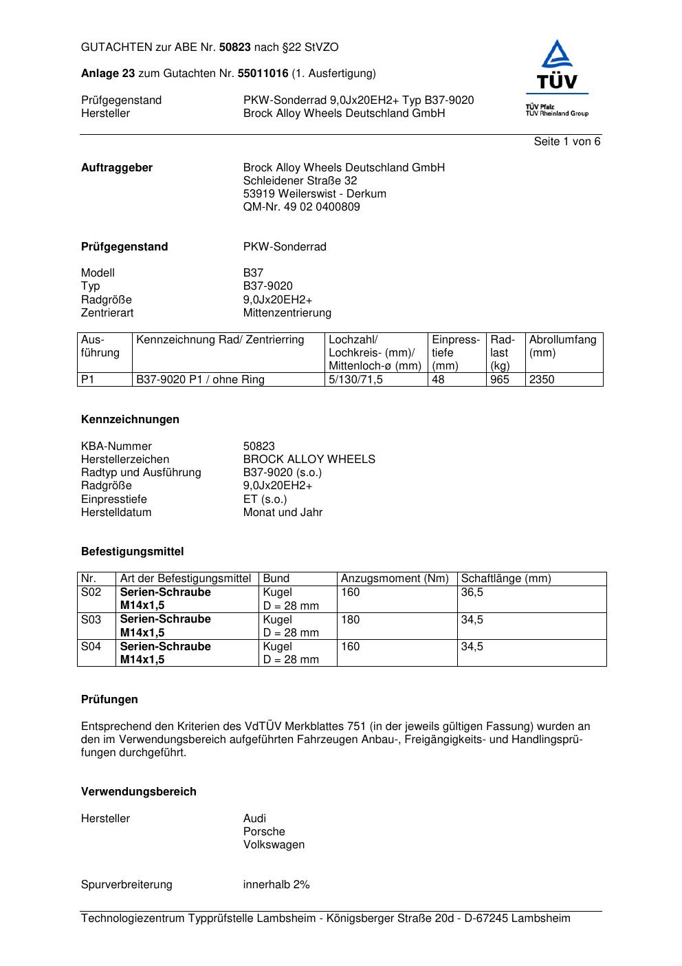 Dieses Gutachten (abe) bezieht sich auf die Alufelge Brock B37-90 20 in der Ausführung ET 0, Mittenloch 0 mm (KBA 50823). Im PDF findest du typischerweise zulässige Reifengrößen, Auflagen/Anbauhinweise und – je nach Dokument – Hinweise zur Eintragung.
