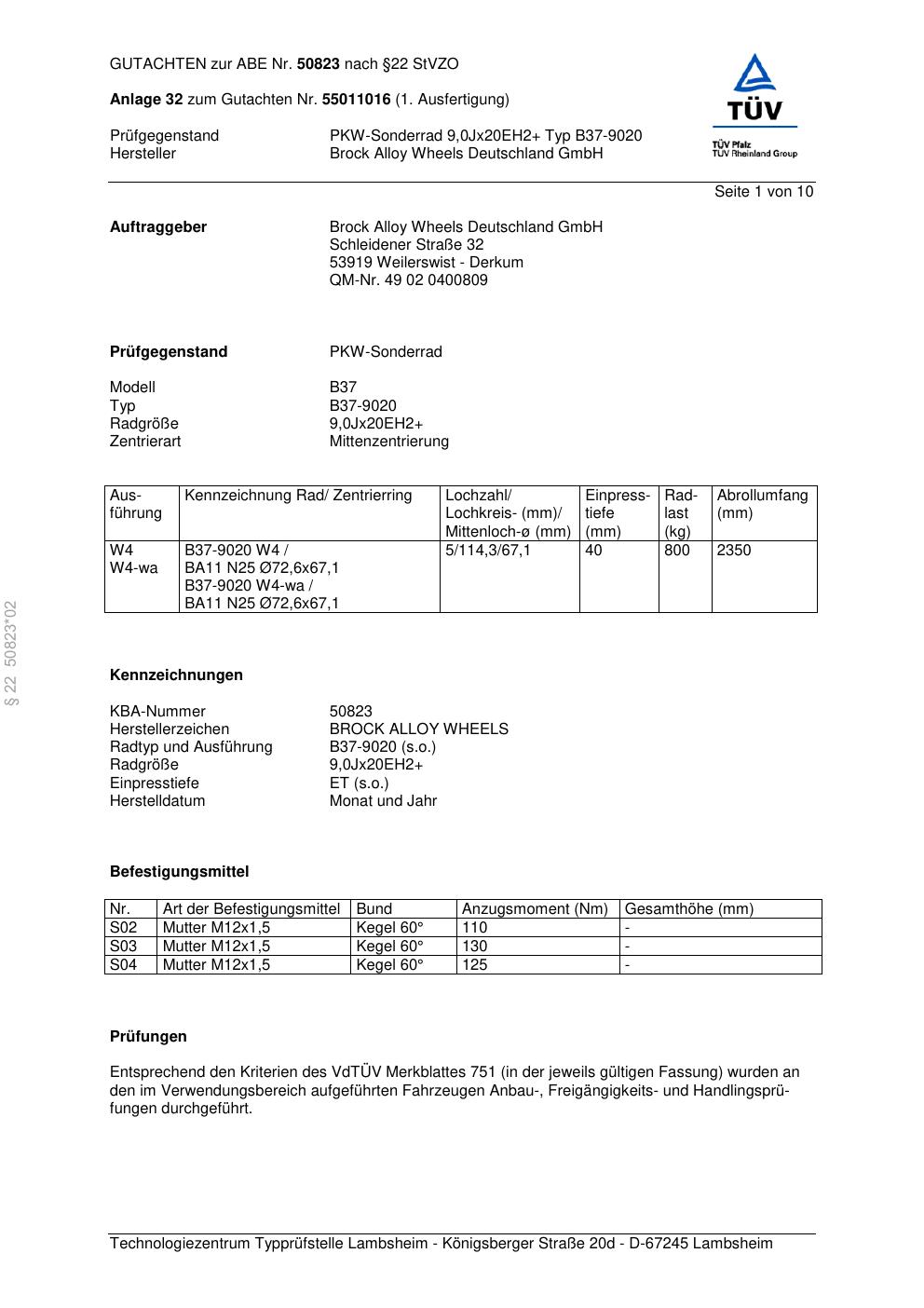 Felgengutachten / abe für Alufelgen Brock B37-90 20 (6Jx67 ET 0, Mittenloch 0 mm) mit KBA 50823 (Zertifikatsnummer 50823). Hier kostenlos als PDF herunterladen. Der Download-Link ist 24 Stunden gültig und kann bis zu zwei Mal verwendet werden.