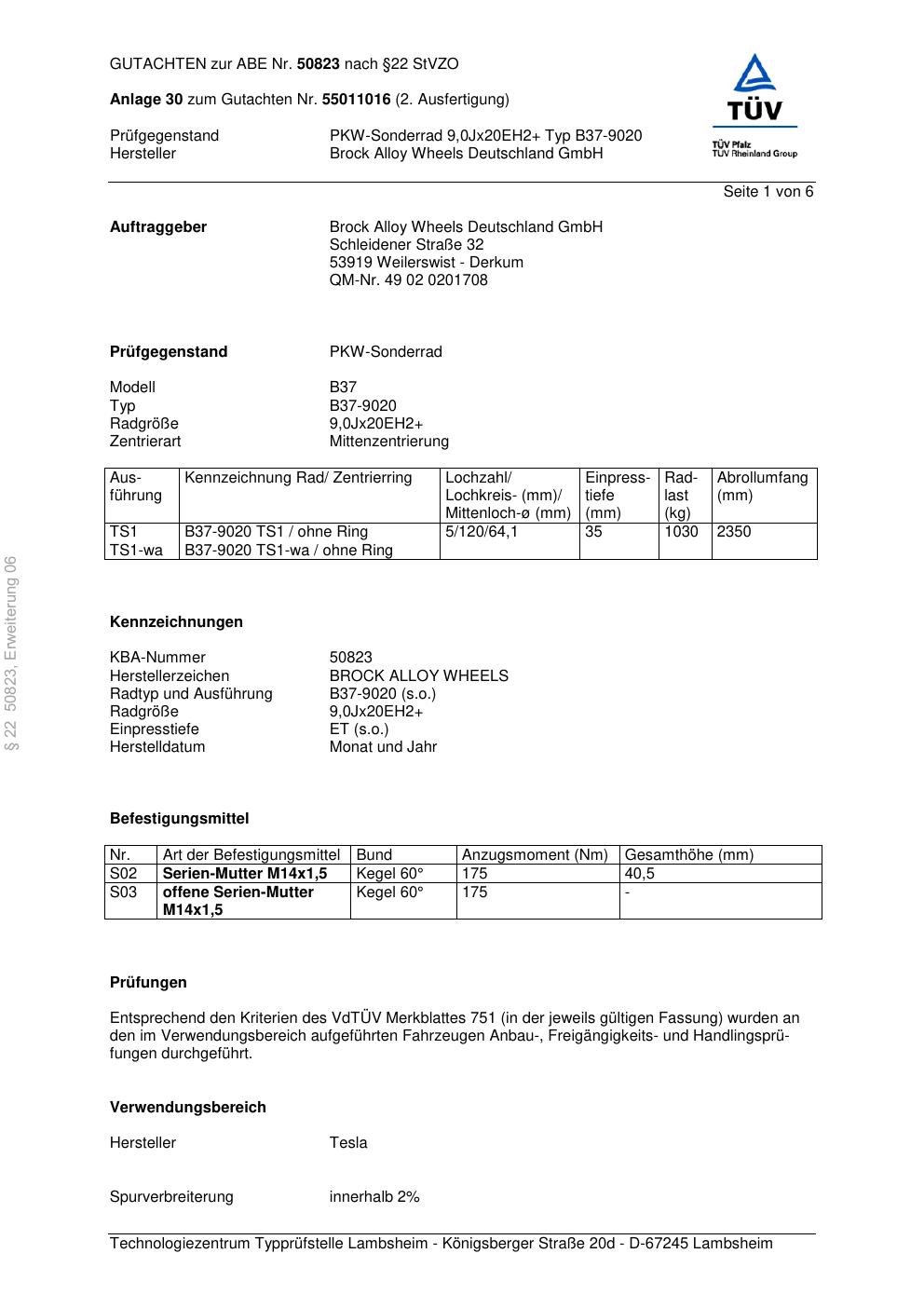 Dieses Gutachten (abe) bezieht sich auf die Alufelge Brock B37-90 20 in der Ausführung ET 0, Mittenloch 0 mm (KBA 50823). Im PDF findest du typischerweise zulässige Reifengrößen, Auflagen/Anbauhinweise und – je nach Dokument – Hinweise zur Eintragung.