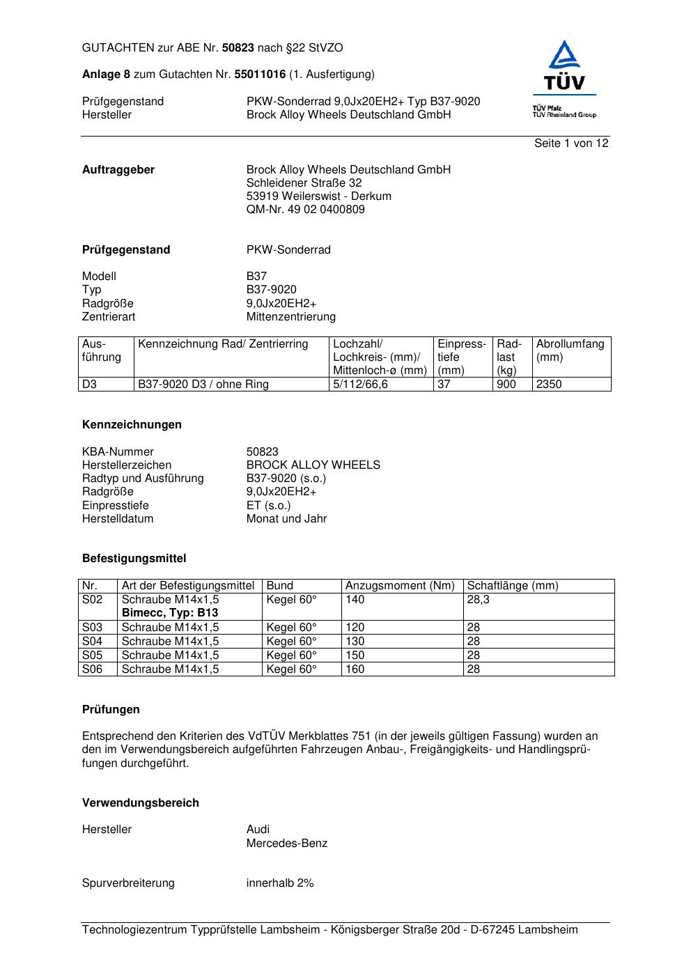 Dieses Gutachten (abe) bezieht sich auf die Alufelge Brock B37-90 20 in der Ausführung ET 0, Mittenloch 0 mm (KBA 50823). Im PDF findest du typischerweise zulässige Reifengrößen, Auflagen/Anbauhinweise und – je nach Dokument – Hinweise zur Eintragung.