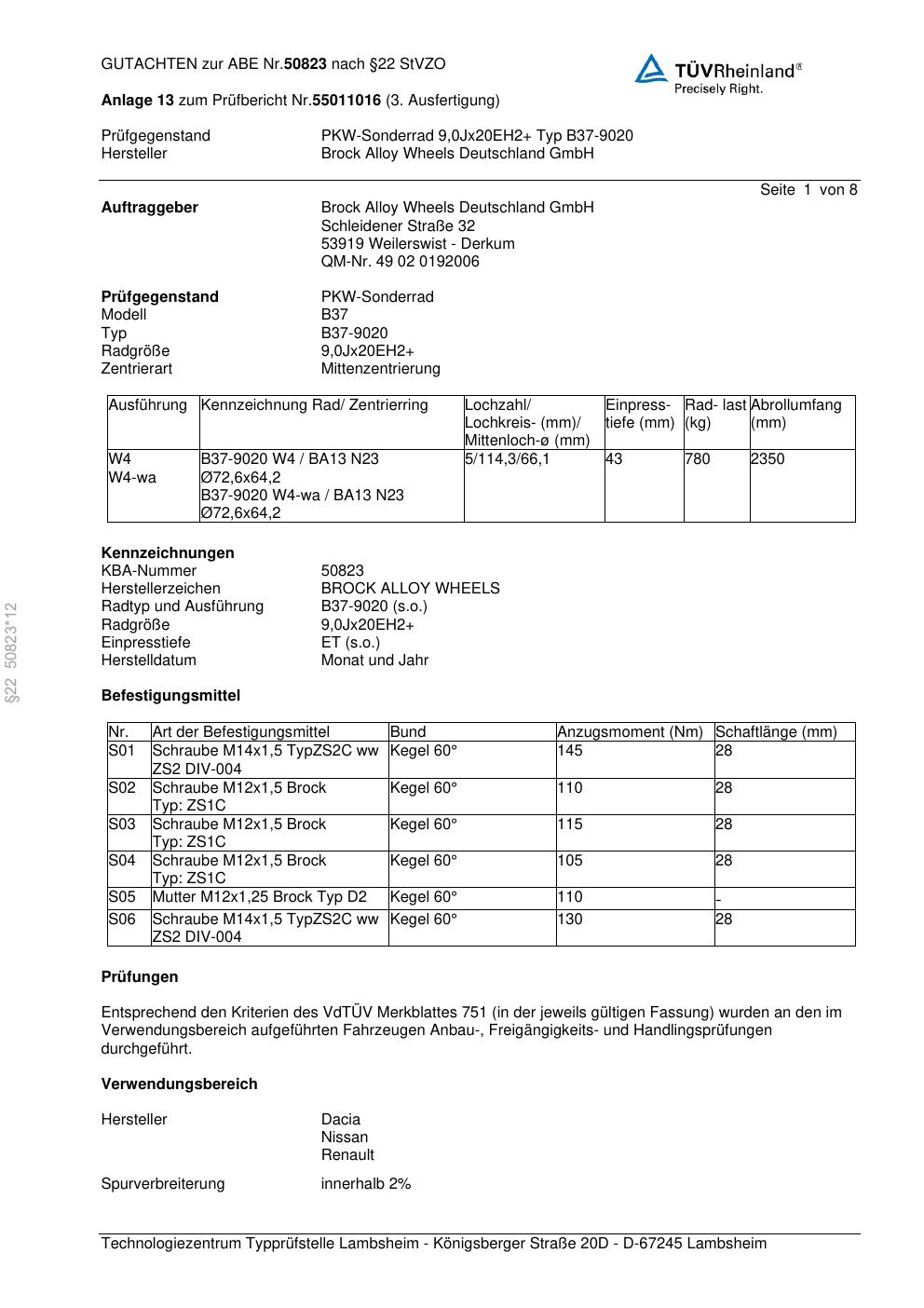 Dieses Gutachten (abe) bezieht sich auf die Alufelge Brock B37-90 20 in der Ausführung 6Jx64 ET 0, Mittenloch 0 mm (KBA 50823). Im PDF findest du typischerweise zulässige Reifengrößen, Auflagen/Anbauhinweise und – je nach Dokument – Hinweise zur Eintragung.