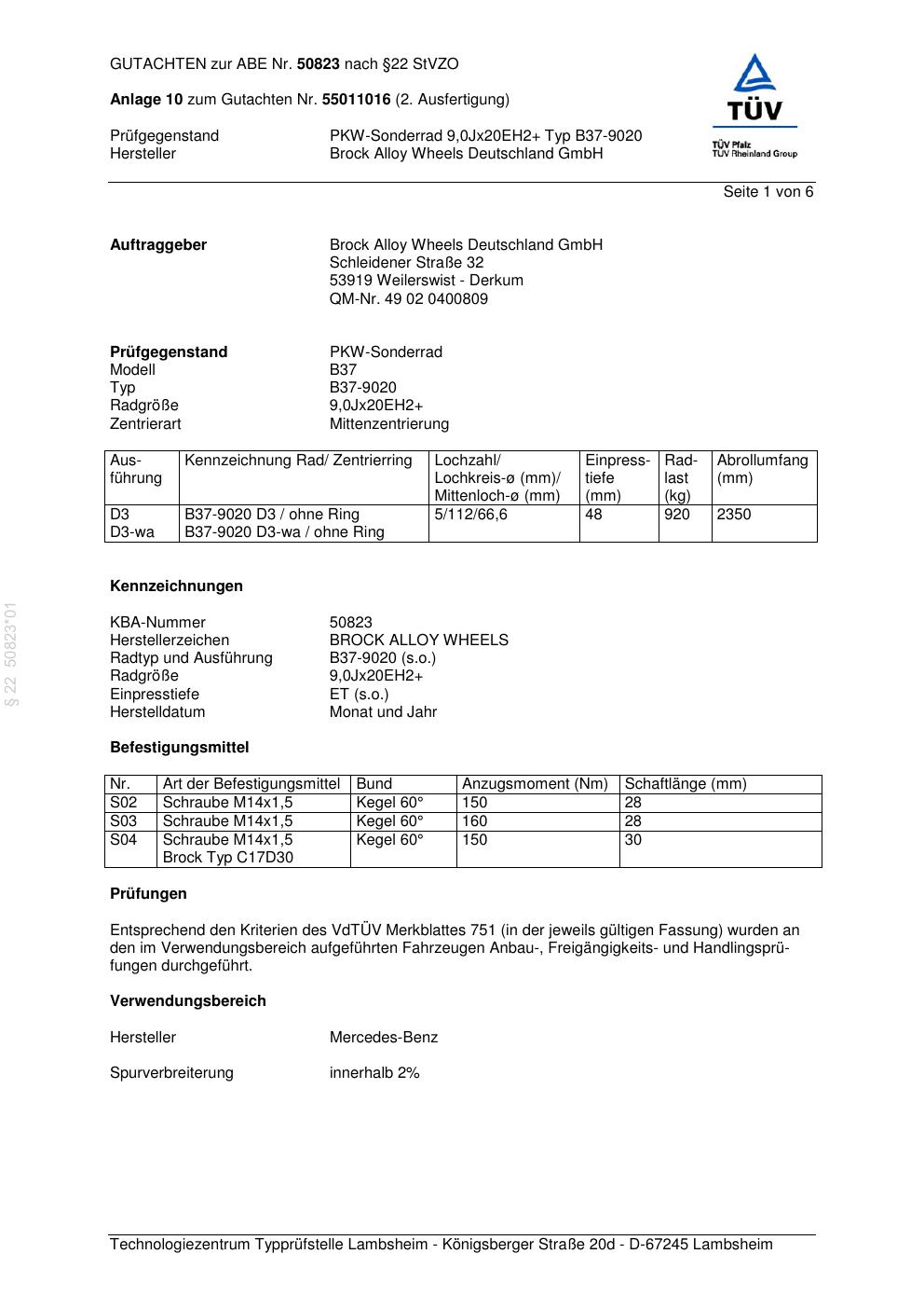 Dieses Gutachten (abe) bezieht sich auf die Alufelge Brock B37-90 20 in der Ausführung ET 0, Mittenloch 0 mm (KBA 50823). Im PDF findest du typischerweise zulässige Reifengrößen, Auflagen/Anbauhinweise und – je nach Dokument – Hinweise zur Eintragung.