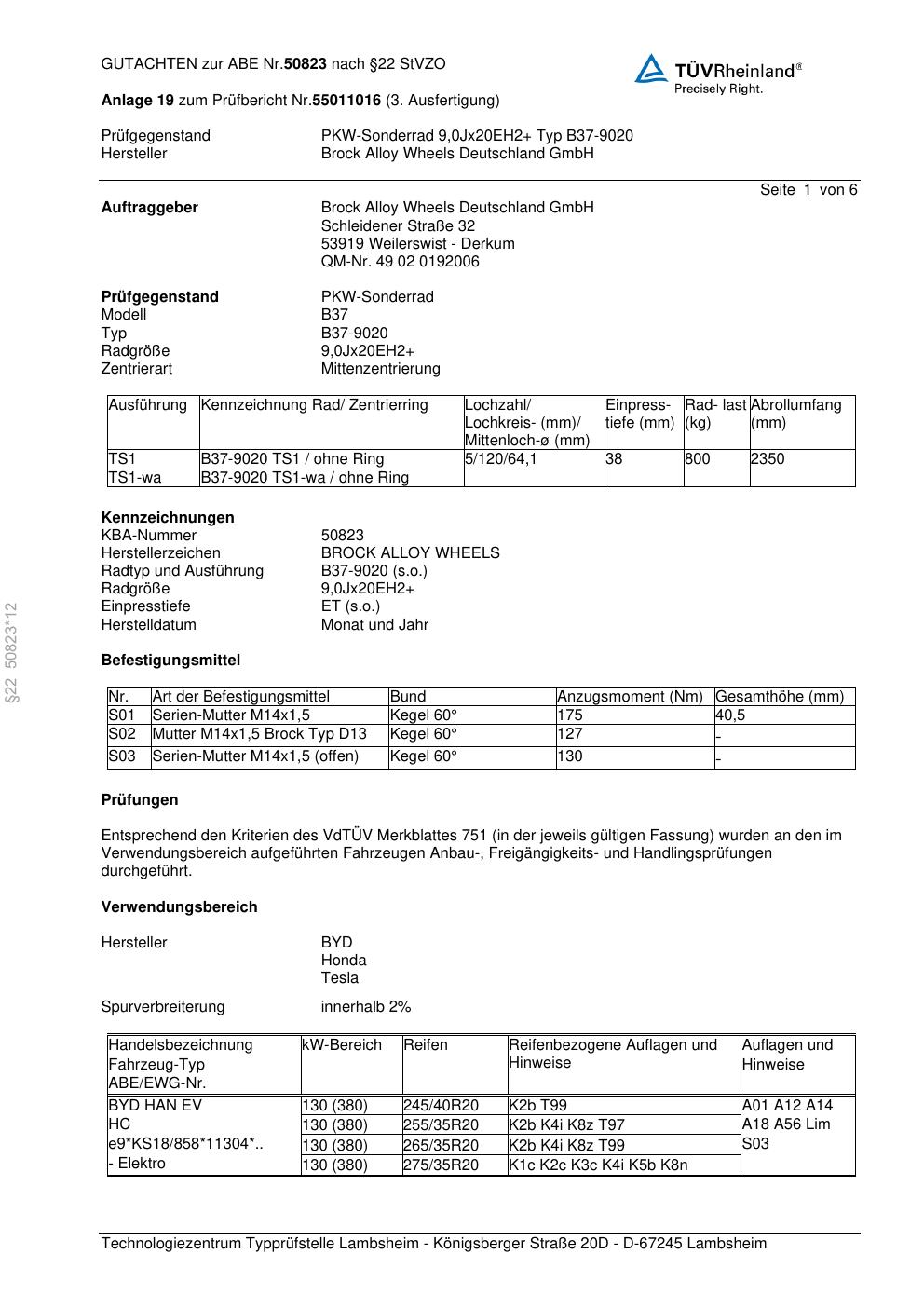 Dieses Gutachten (abe) bezieht sich auf die Alufelge Brock B37-90 20 in der Ausführung ET 0, Mittenloch 0 mm (KBA 50823). Im PDF findest du typischerweise zulässige Reifengrößen, Auflagen/Anbauhinweise und – je nach Dokument – Hinweise zur Eintragung.