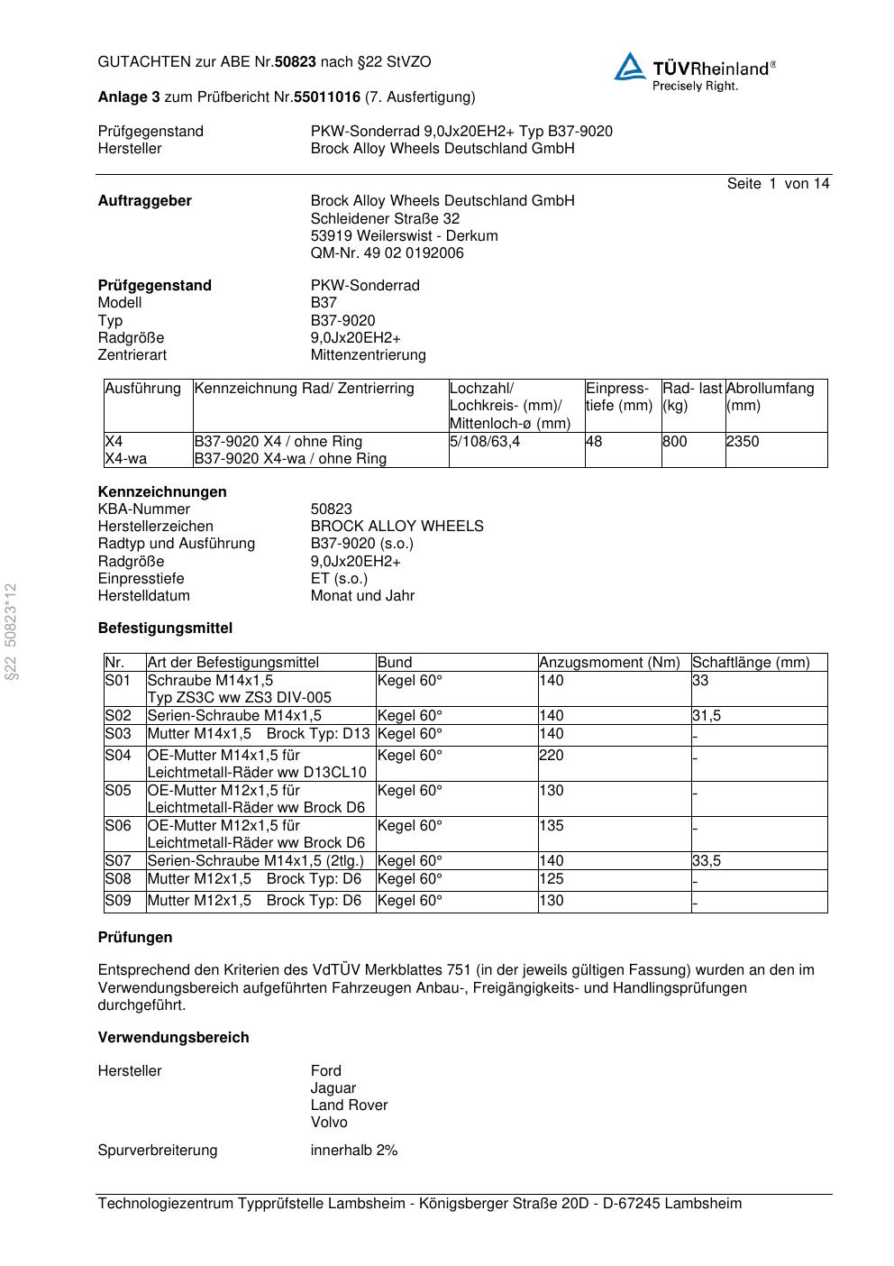Dieses Gutachten (abe) bezieht sich auf die Alufelge Brock B37-90 20 in der Ausführung 8.5Jx21 ET 0, Mittenloch 0 mm (KBA 50823). Im PDF findest du typischerweise zulässige Reifengrößen, Auflagen/Anbauhinweise und – je nach Dokument – Hinweise zur Eintragung.