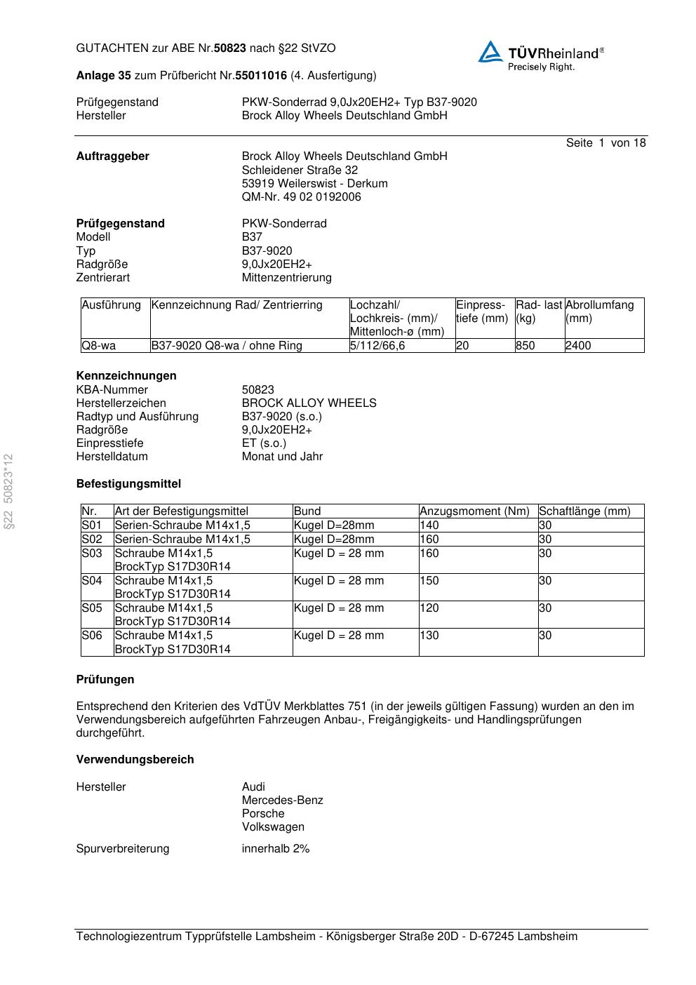 Dieses Gutachten (abe) bezieht sich auf die Alufelge Brock B37-90 20 in der Ausführung ET 0, Mittenloch 0 mm (KBA 50823). Im PDF findest du typischerweise zulässige Reifengrößen, Auflagen/Anbauhinweise und – je nach Dokument – Hinweise zur Eintragung.