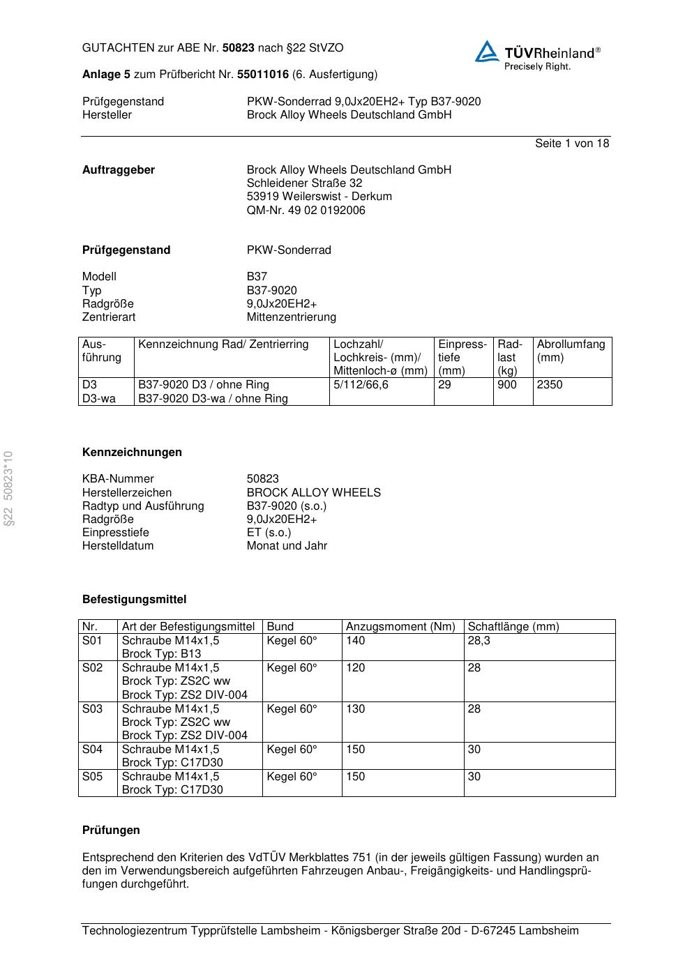 Dieses Gutachten (abe) bezieht sich auf die Alufelge Brock B37-90 20 in der Ausführung ET 0, Mittenloch 0 mm (KBA 50823). Im PDF findest du typischerweise zulässige Reifengrößen, Auflagen/Anbauhinweise und – je nach Dokument – Hinweise zur Eintragung.