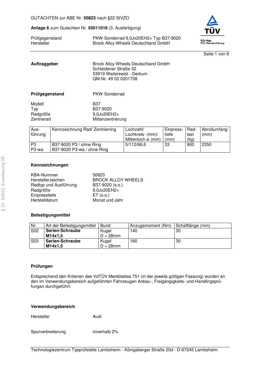 Dieses Gutachten (abe) bezieht sich auf die Alufelge Brock B37-90 20 in der Ausführung ET 0, Mittenloch 0 mm (KBA 50823). Im PDF findest du typischerweise zulässige Reifengrößen, Auflagen/Anbauhinweise und – je nach Dokument – Hinweise zur Eintragung.