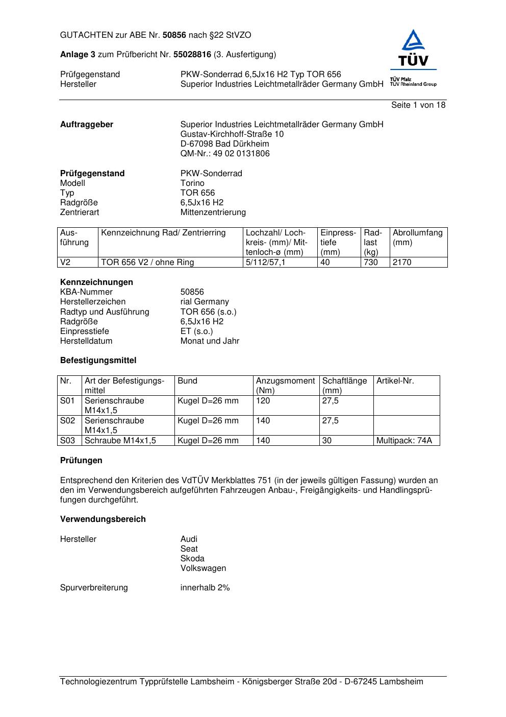Dieses Gutachten (abe) bezieht sich auf die Alufelge Rial TOR 656 in der Ausführung 6.5Jx16 ET 0, Mittenloch 0 mm (KBA 50856). Im PDF findest du typischerweise zulässige Reifengrößen, Auflagen/Anbauhinweise und – je nach Dokument – Hinweise zur Eintragung.