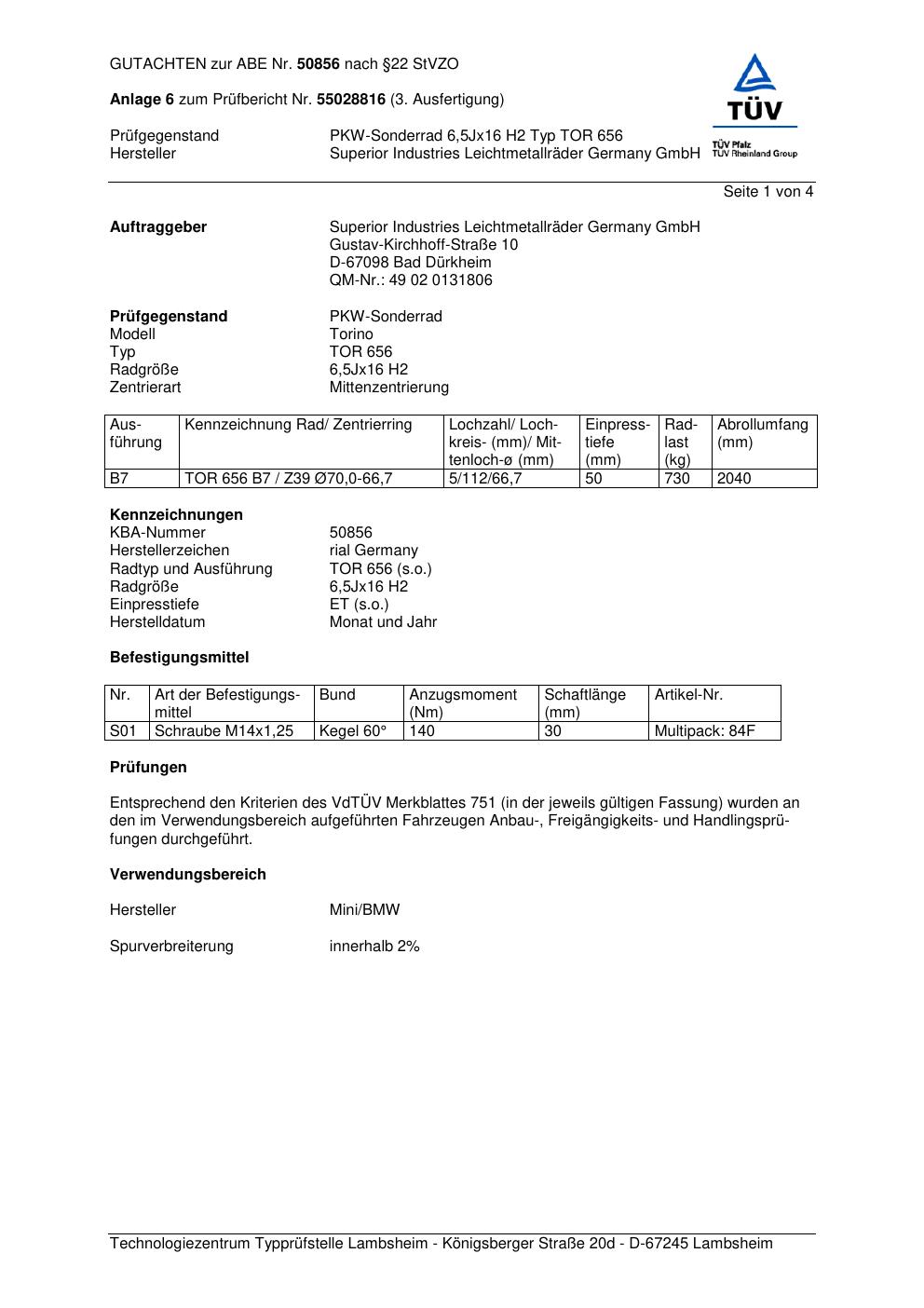 Dieses Gutachten (abe) bezieht sich auf die Alufelge Rial TOR 656 in der Ausführung 6.5Jx16 ET 0, Mittenloch 0 mm (KBA 50856). Im PDF findest du typischerweise zulässige Reifengrößen, Auflagen/Anbauhinweise und – je nach Dokument – Hinweise zur Eintragung.