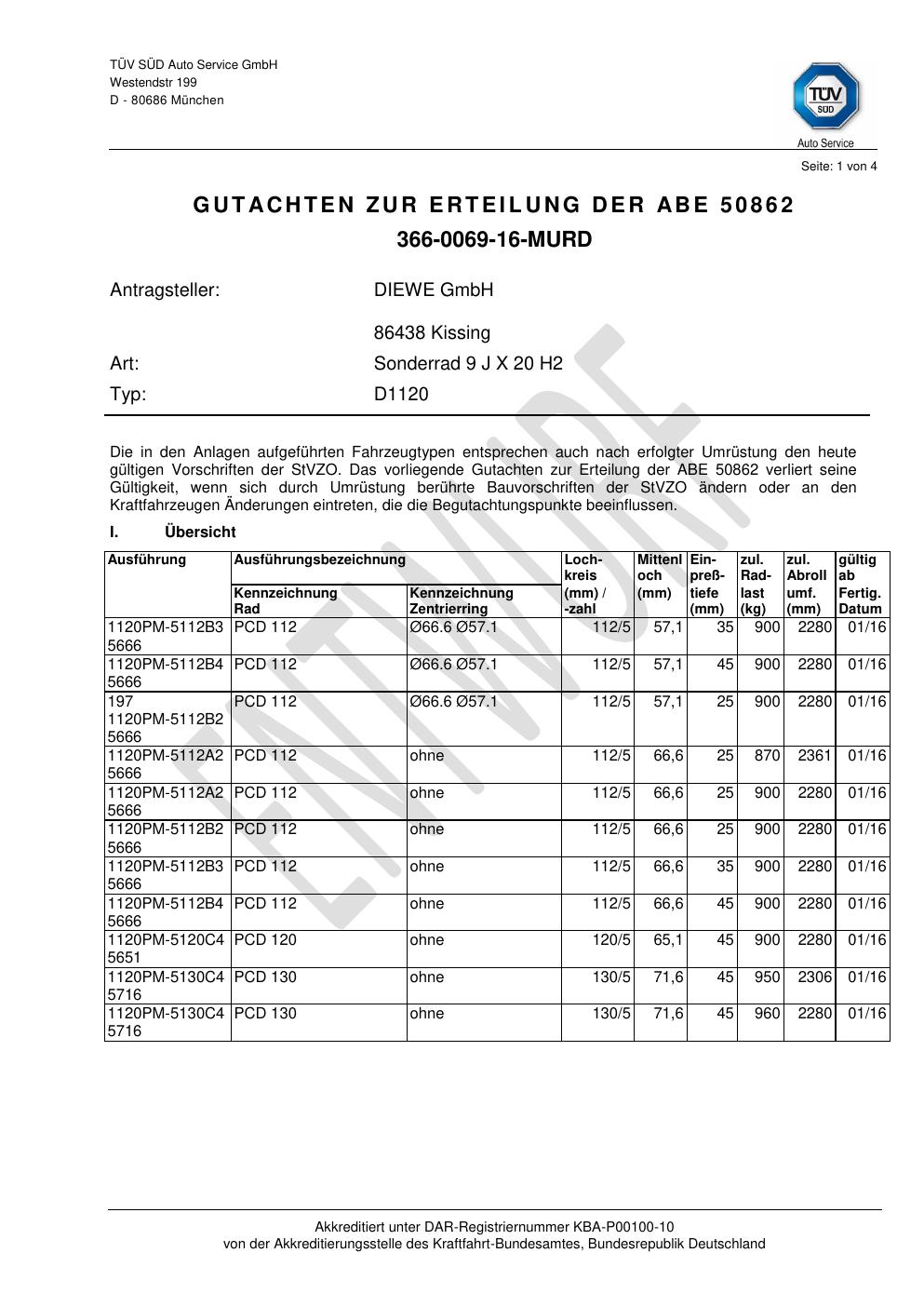 Felgengutachten / abe für Alufelgen co-diewe D1120 (9Jx2 ET 0, Mittenloch 0 mm) mit KBA 50862 (Zertifikatsnummer 50862). Hier kostenlos als PDF herunterladen. Der Download-Link ist 24 Stunden gültig und kann bis zu zwei Mal verwendet werden.