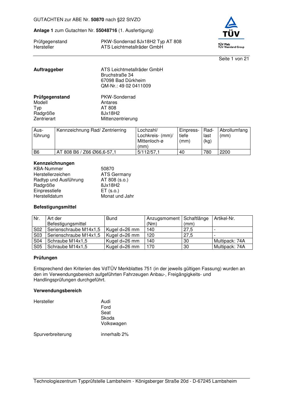 Dieses Gutachten (abe) bezieht sich auf die Alufelge ATS AT 808 in der Ausführung 8Jx18 ET 0, Mittenloch 0 mm (KBA 50870). Im PDF findest du typischerweise zulässige Reifengrößen, Auflagen/Anbauhinweise und – je nach Dokument – Hinweise zur Eintragung.