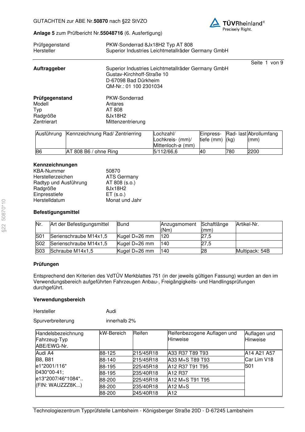 Dieses Gutachten (abe) bezieht sich auf die Alufelge ATS AT 808 in der Ausführung 8Jx18 ET 0, Mittenloch 0 mm (KBA 50870). Im PDF findest du typischerweise zulässige Reifengrößen, Auflagen/Anbauhinweise und – je nach Dokument – Hinweise zur Eintragung.