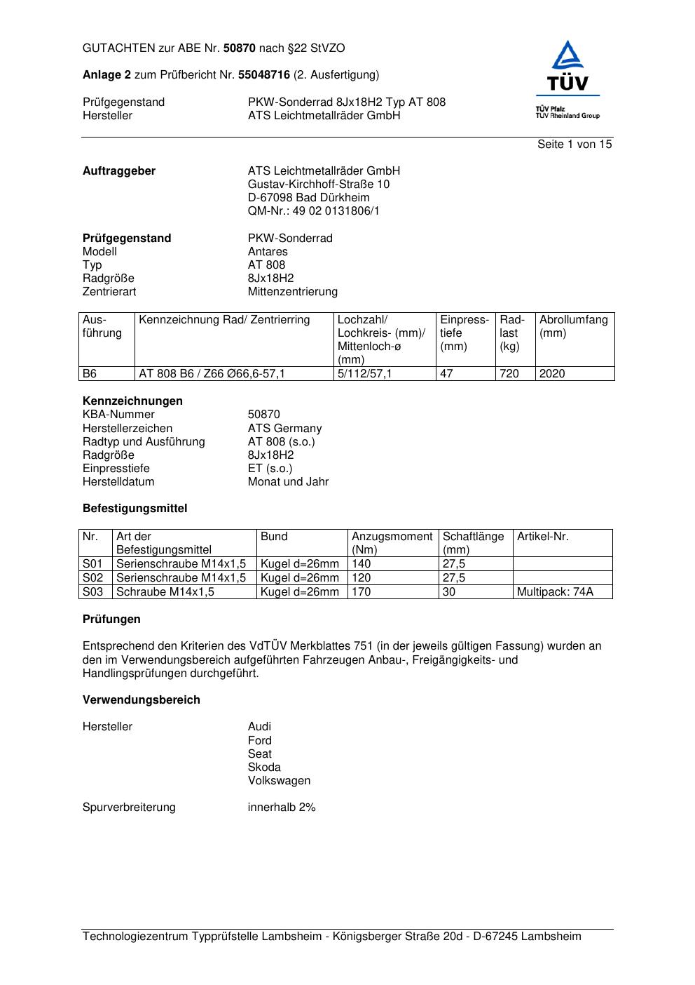 Dieses Gutachten (abe) bezieht sich auf die Alufelge ATS AT 808 in der Ausführung 8Jx18 ET 0, Mittenloch 0 mm (KBA 50870). Im PDF findest du typischerweise zulässige Reifengrößen, Auflagen/Anbauhinweise und – je nach Dokument – Hinweise zur Eintragung.
