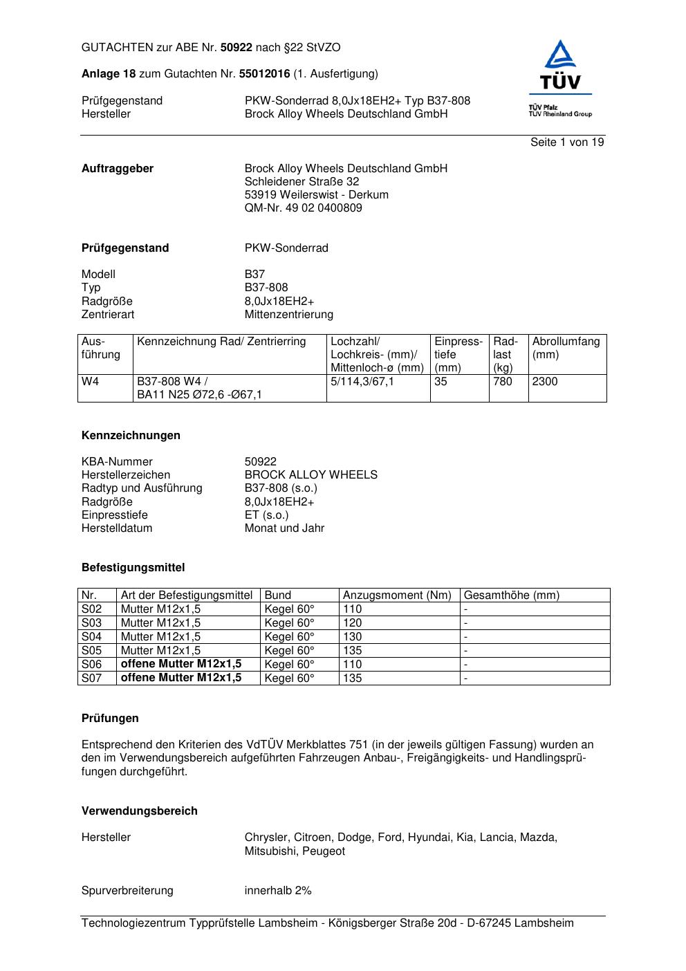 Dieses Gutachten (abe) bezieht sich auf die Alufelge Brock B37-80 8 in der Ausführung ET 0, Mittenloch 0 mm (KBA 50922). Im PDF findest du typischerweise zulässige Reifengrößen, Auflagen/Anbauhinweise und – je nach Dokument – Hinweise zur Eintragung.