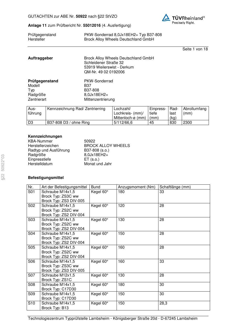 Dieses Gutachten (abe) bezieht sich auf die Alufelge Brock B37-80 8 in der Ausführung ET 0, Mittenloch 0 mm (KBA 50922). Im PDF findest du typischerweise zulässige Reifengrößen, Auflagen/Anbauhinweise und – je nach Dokument – Hinweise zur Eintragung.