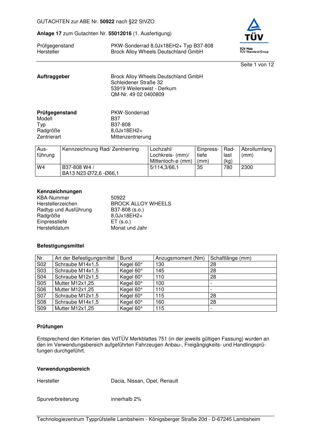 Dieses Gutachten (abe) bezieht sich auf die Alufelge Brock B37-80 8 in der Ausführung ET 0, Mittenloch 0 mm (KBA 50922). Im PDF findest du typischerweise zulässige Reifengrößen, Auflagen/Anbauhinweise und – je nach Dokument – Hinweise zur Eintragung.