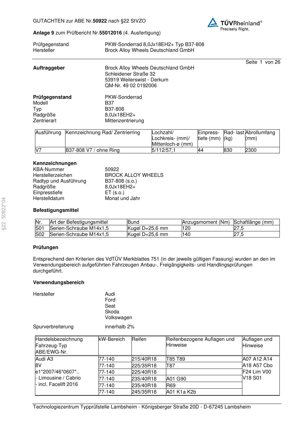 Dieses Gutachten (abe) bezieht sich auf die Alufelge Brock B37-80 8 in der Ausführung ET 0, Mittenloch 0 mm (KBA 50922). Im PDF findest du typischerweise zulässige Reifengrößen, Auflagen/Anbauhinweise und – je nach Dokument – Hinweise zur Eintragung.