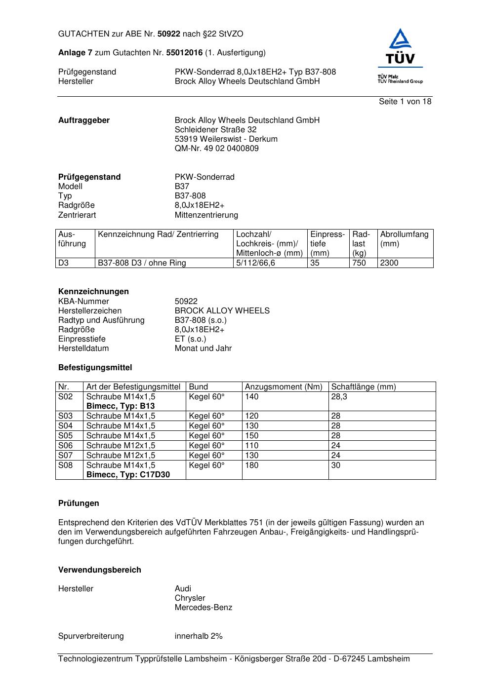 Dieses Gutachten (abe) bezieht sich auf die Alufelge Brock B37-80 8 in der Ausführung ET 0, Mittenloch 0 mm (KBA 50922). Im PDF findest du typischerweise zulässige Reifengrößen, Auflagen/Anbauhinweise und – je nach Dokument – Hinweise zur Eintragung.