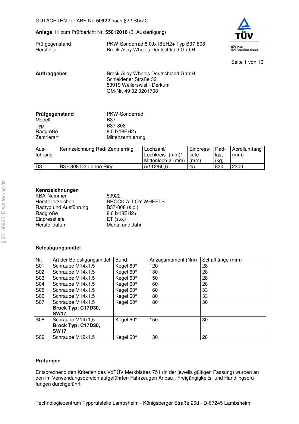 Dieses Gutachten (abe) bezieht sich auf die Alufelge Brock B37-808 in der Ausführung ET 0, Mittenloch 0 mm (KBA 50922). Im PDF findest du typischerweise zulässige Reifengrößen, Auflagen/Anbauhinweise und – je nach Dokument – Hinweise zur Eintragung.