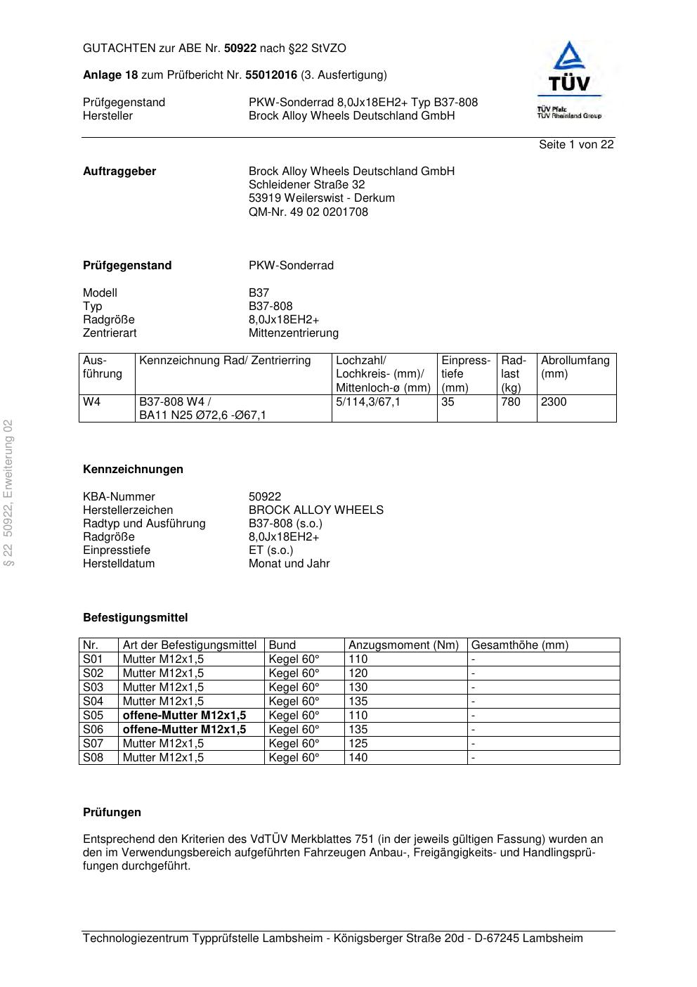 Dieses Gutachten (abe) bezieht sich auf die Alufelge Brock B37-808 in der Ausführung ET 0, Mittenloch 0 mm (KBA 50922). Im PDF findest du typischerweise zulässige Reifengrößen, Auflagen/Anbauhinweise und – je nach Dokument – Hinweise zur Eintragung.