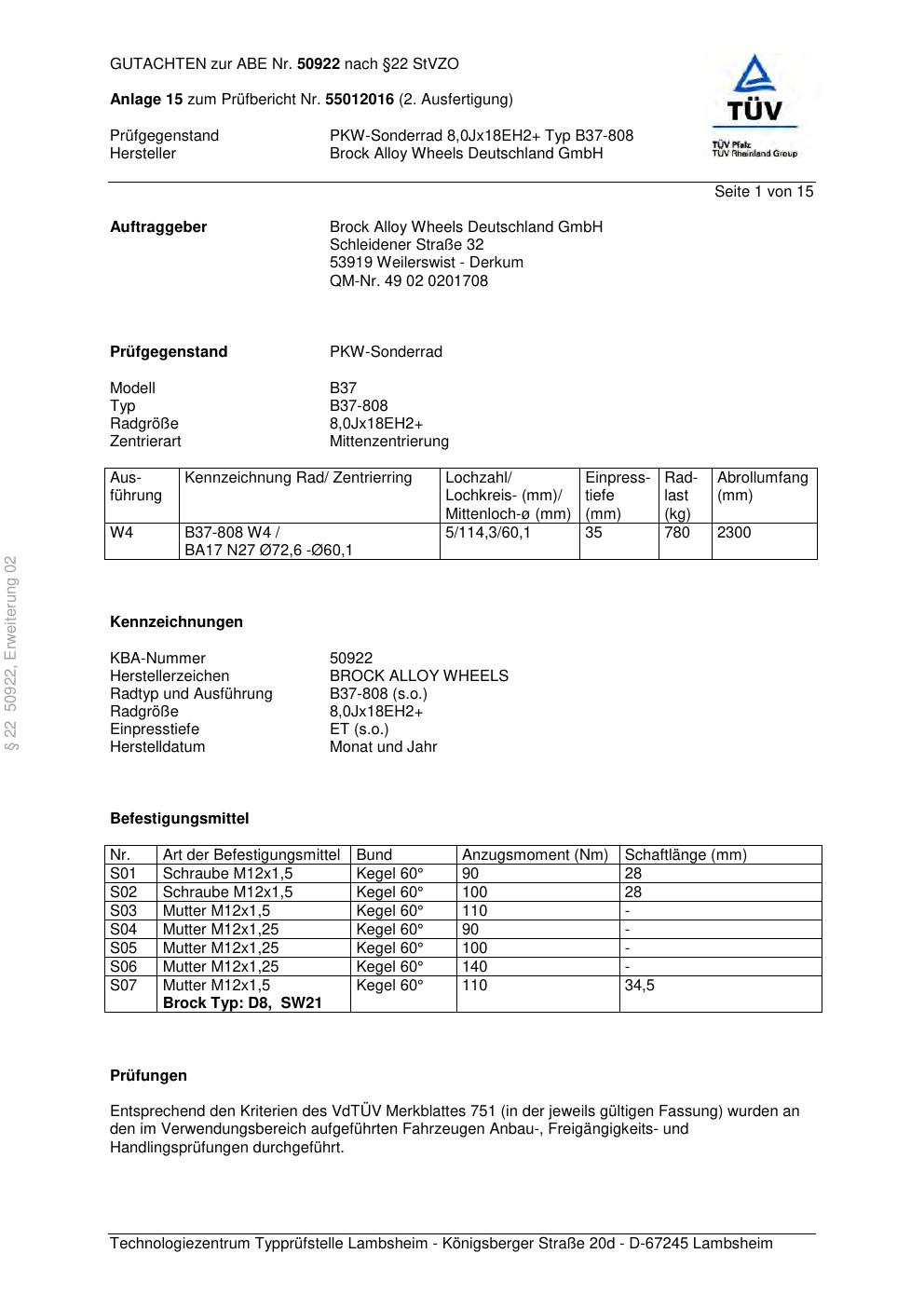 Dieses Gutachten (abe) bezieht sich auf die Alufelge Brock B37-808 in der Ausführung ET 0, Mittenloch 0 mm (KBA 50922). Im PDF findest du typischerweise zulässige Reifengrößen, Auflagen/Anbauhinweise und – je nach Dokument – Hinweise zur Eintragung.