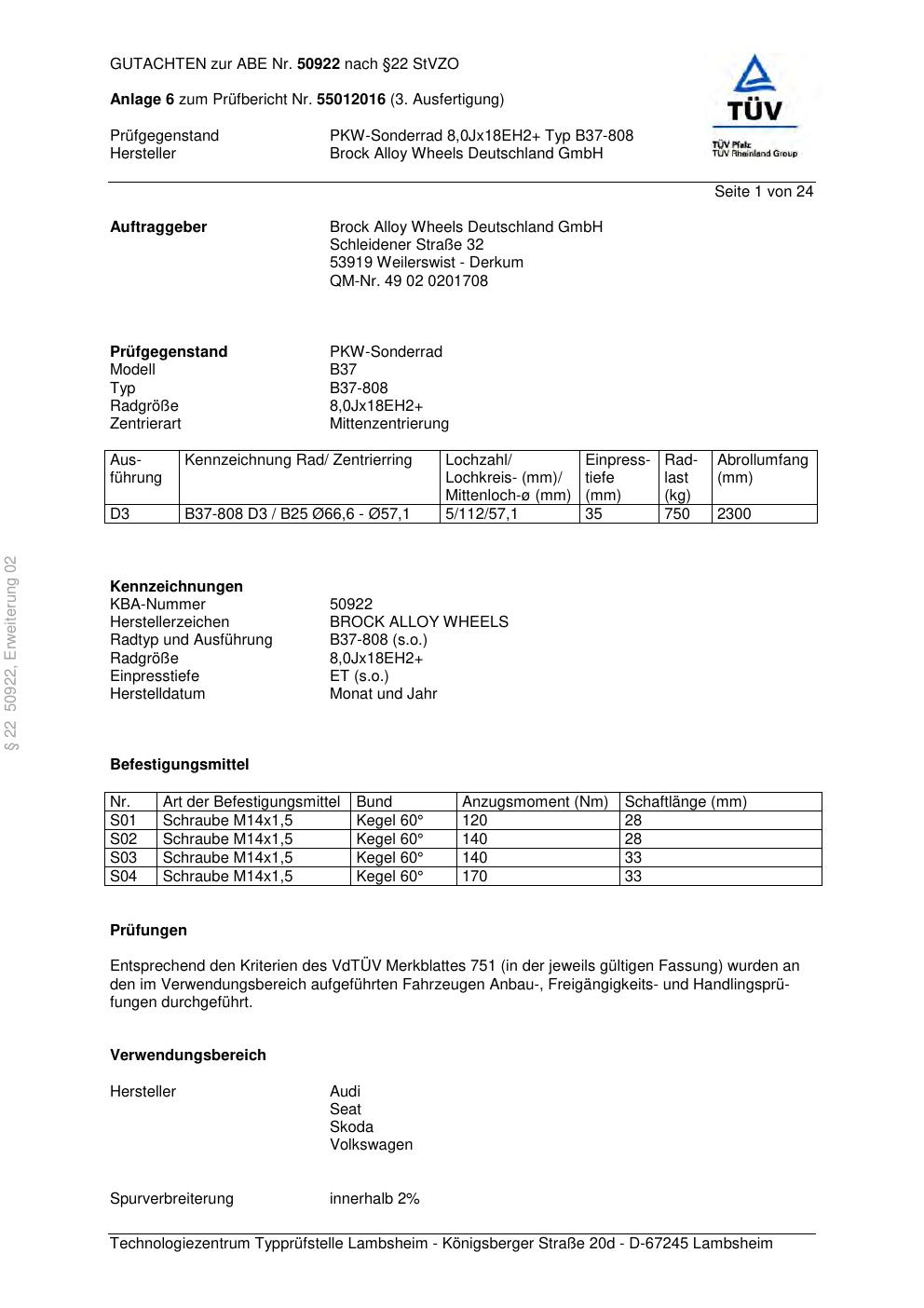 Dieses Gutachten (abe) bezieht sich auf die Alufelge Brock B37-808 in der Ausführung 70Jx2 ET 0, Mittenloch 0 mm (KBA 50922). Im PDF findest du typischerweise zulässige Reifengrößen, Auflagen/Anbauhinweise und – je nach Dokument – Hinweise zur Eintragung.