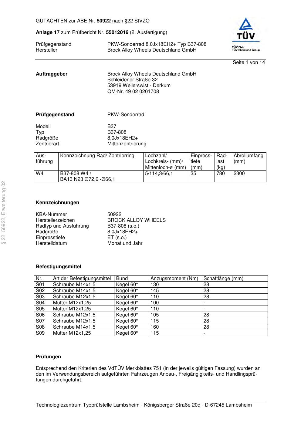 Dieses Gutachten (abe) bezieht sich auf die Alufelge Brock B37-808 in der Ausführung ET 0, Mittenloch 0 mm (KBA 50922). Im PDF findest du typischerweise zulässige Reifengrößen, Auflagen/Anbauhinweise und – je nach Dokument – Hinweise zur Eintragung.
