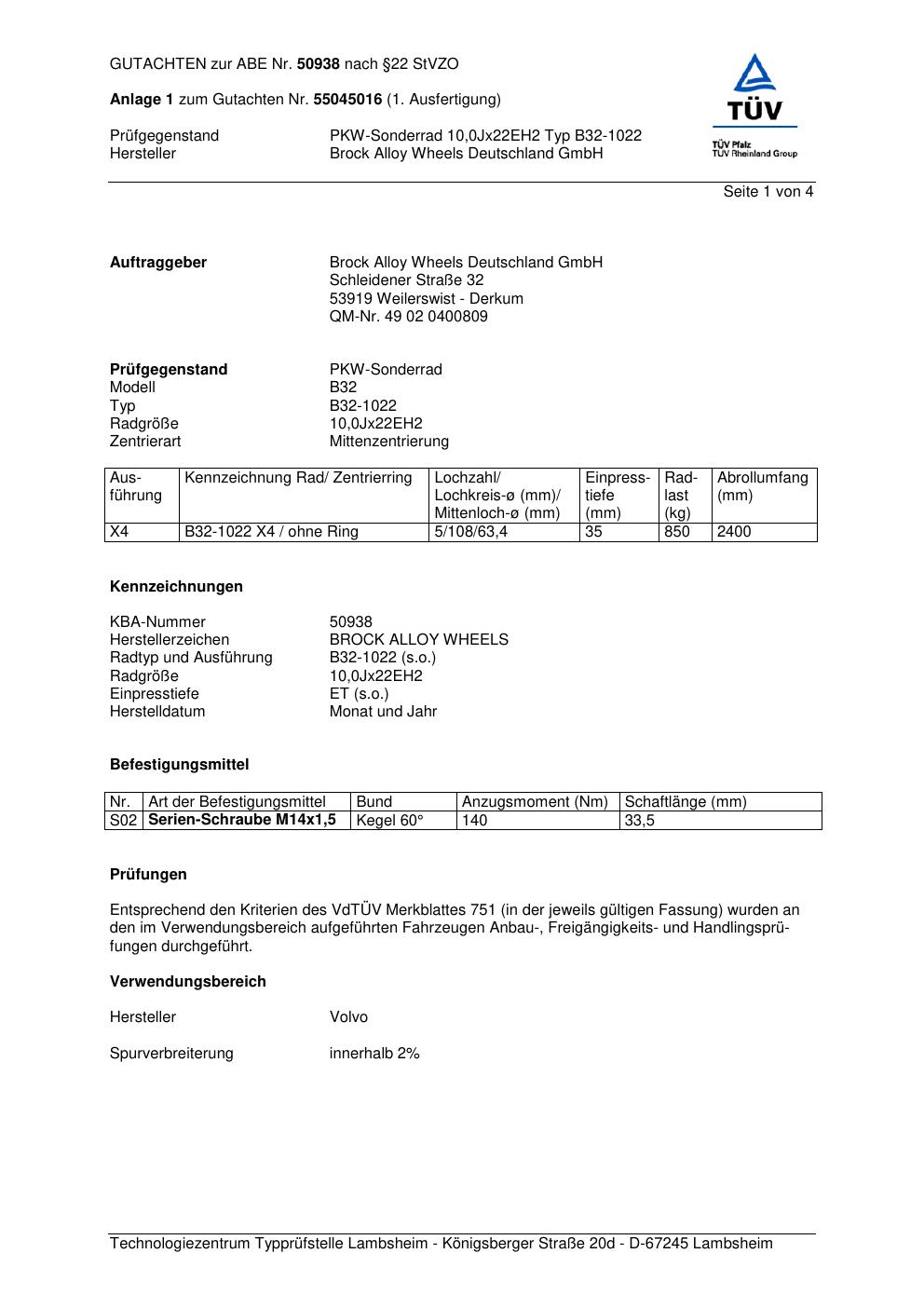 Dieses Gutachten (abe) bezieht sich auf die Alufelge Brock B32-10 22 in der Ausführung ET 0, Mittenloch 0 mm (KBA 50938). Im PDF findest du typischerweise zulässige Reifengrößen, Auflagen/Anbauhinweise und – je nach Dokument – Hinweise zur Eintragung.
