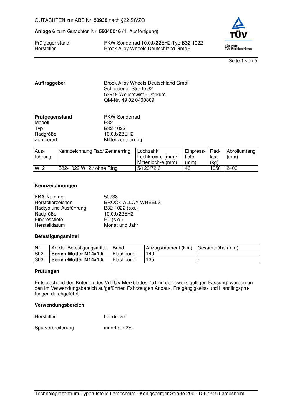 Dieses Gutachten (abe) bezieht sich auf die Alufelge Brock B32-10 22 in der Ausführung ET 0, Mittenloch 0 mm (KBA 50938). Im PDF findest du typischerweise zulässige Reifengrößen, Auflagen/Anbauhinweise und – je nach Dokument – Hinweise zur Eintragung.