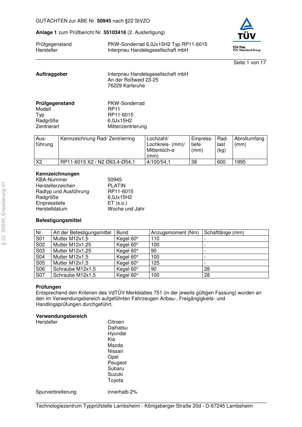 Dieses Gutachten (abe) bezieht sich auf die Alufelge Platin RP11-601 5 in der Ausführung 6Jx15 ET 0, Mittenloch 0 mm (KBA 50945). Im PDF findest du typischerweise zulässige Reifengrößen, Auflagen/Anbauhinweise und – je nach Dokument – Hinweise zur Eintragung.