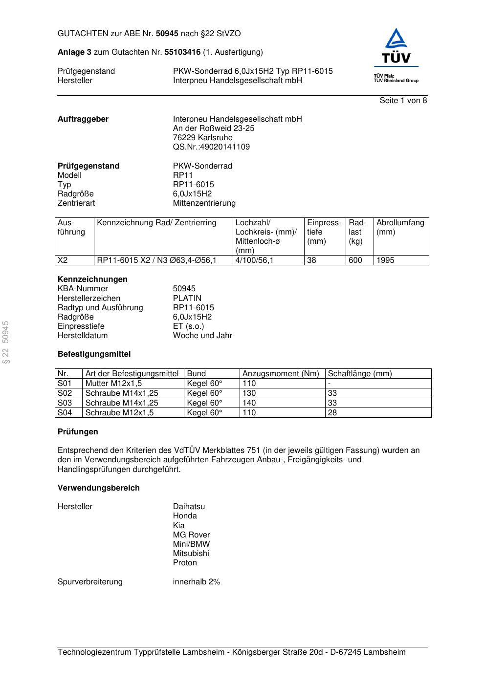Dieses Gutachten (abe) bezieht sich auf die Alufelge Platin RP11-601 5 in der Ausführung 6Jx15 ET 0, Mittenloch 0 mm (KBA 50945). Im PDF findest du typischerweise zulässige Reifengrößen, Auflagen/Anbauhinweise und – je nach Dokument – Hinweise zur Eintragung.