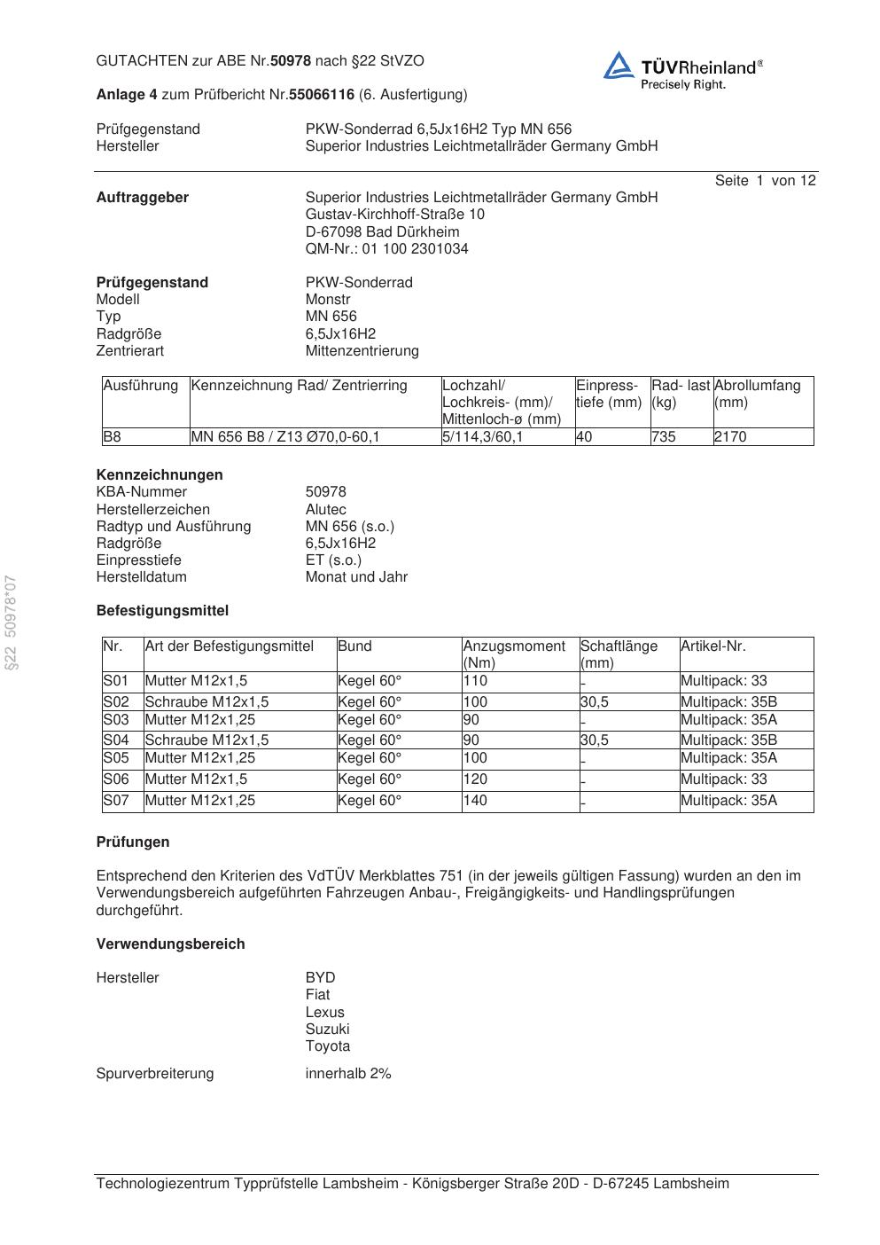Dieses Gutachten (abe) bezieht sich auf die Alufelge ALUTEC MN 656 in der Ausführung 6.5Jx16 ET 0, Mittenloch 0 mm (KBA 50978). Im PDF findest du typischerweise zulässige Reifengrößen, Auflagen/Anbauhinweise und – je nach Dokument – Hinweise zur Eintragung.