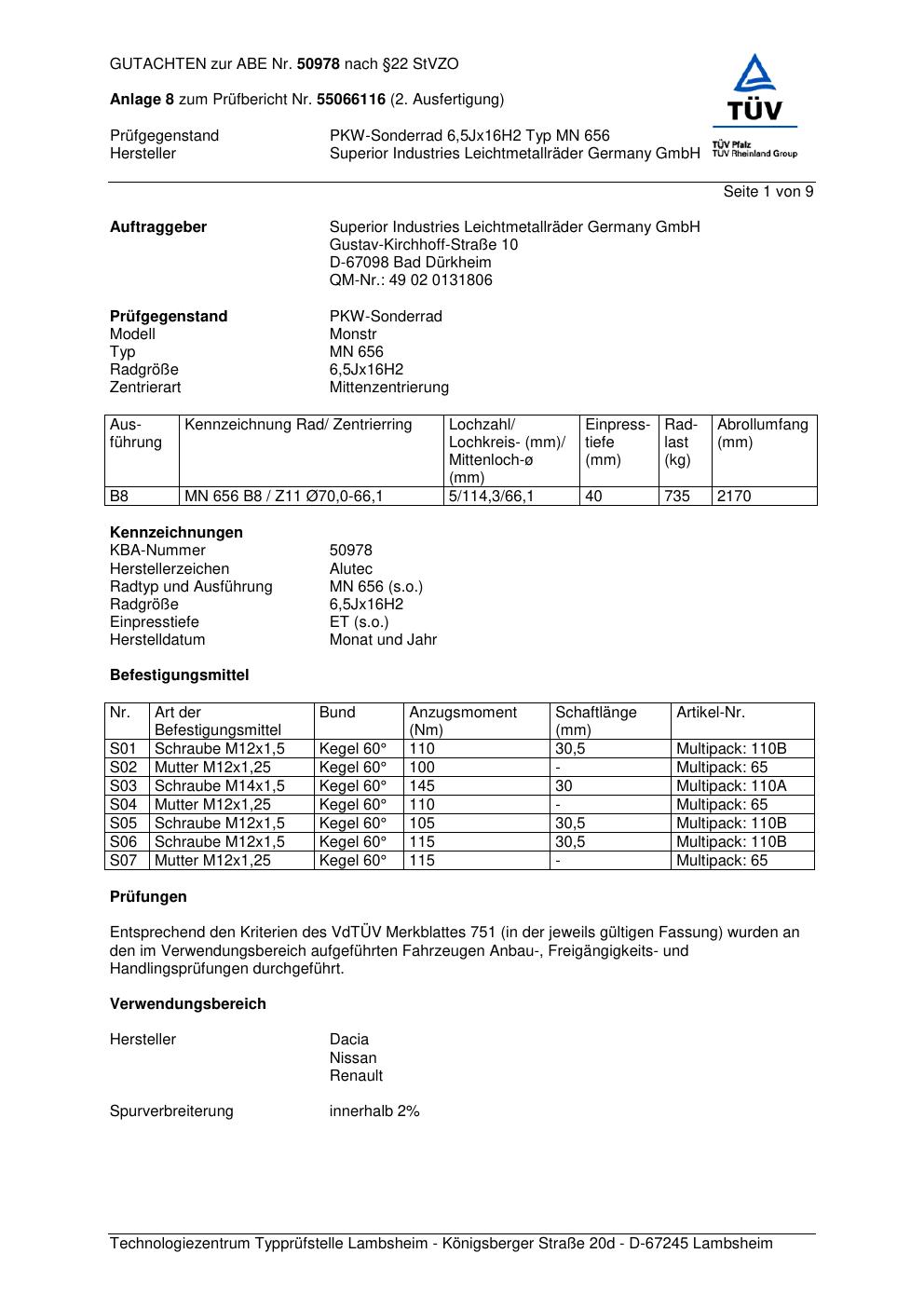 Dieses Gutachten (abe) bezieht sich auf die Alufelge ALUTEC MN 656 in der Ausführung 6.5Jx16 ET 0, Mittenloch 0 mm (KBA 50978). Im PDF findest du typischerweise zulässige Reifengrößen, Auflagen/Anbauhinweise und – je nach Dokument – Hinweise zur Eintragung.