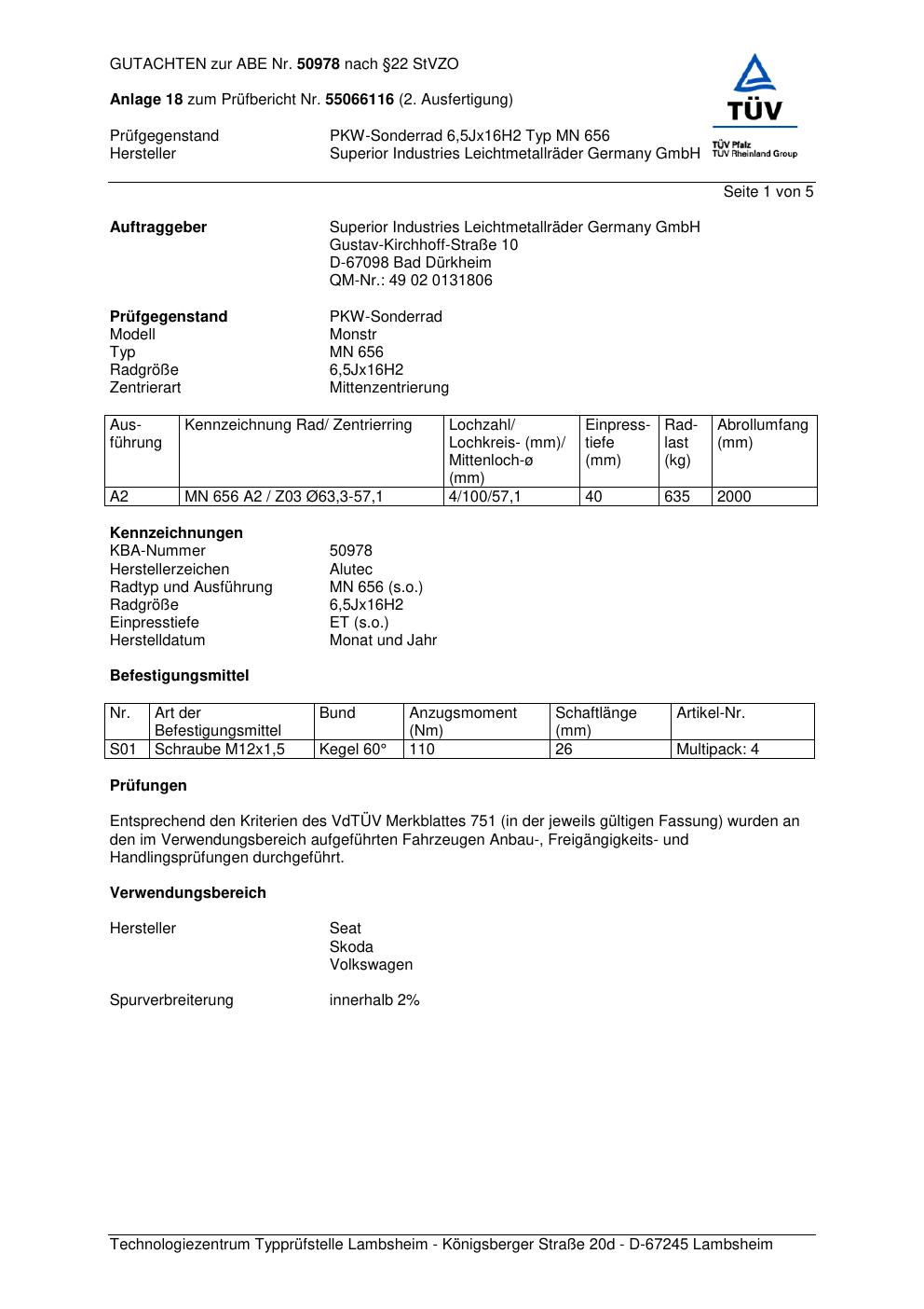 Dieses Gutachten (abe) bezieht sich auf die Alufelge ALUTEC MN 656 in der Ausführung 6.5Jx16 ET 0, Mittenloch 0 mm (KBA 50978). Im PDF findest du typischerweise zulässige Reifengrößen, Auflagen/Anbauhinweise und – je nach Dokument – Hinweise zur Eintragung.