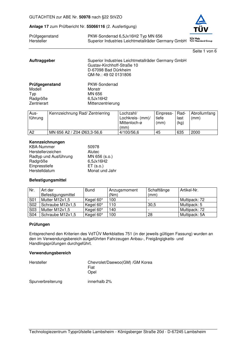 Dieses Gutachten (abe) bezieht sich auf die Alufelge ALUTEC MN 656 in der Ausführung 6.5Jx16 ET 0, Mittenloch 0 mm (KBA 50978). Im PDF findest du typischerweise zulässige Reifengrößen, Auflagen/Anbauhinweise und – je nach Dokument – Hinweise zur Eintragung.