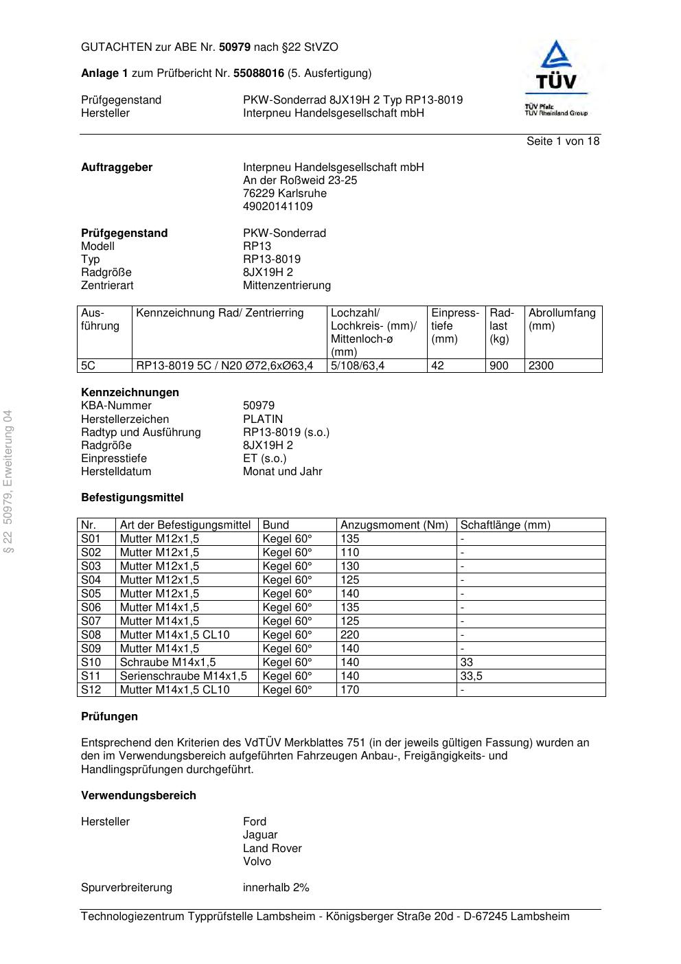 Dieses Gutachten (abe) bezieht sich auf die Alufelge Platin RP13-8019 in der Ausführung ET 0, Mittenloch 0 mm (KBA 50979). Im PDF findest du typischerweise zulässige Reifengrößen, Auflagen/Anbauhinweise und – je nach Dokument – Hinweise zur Eintragung.