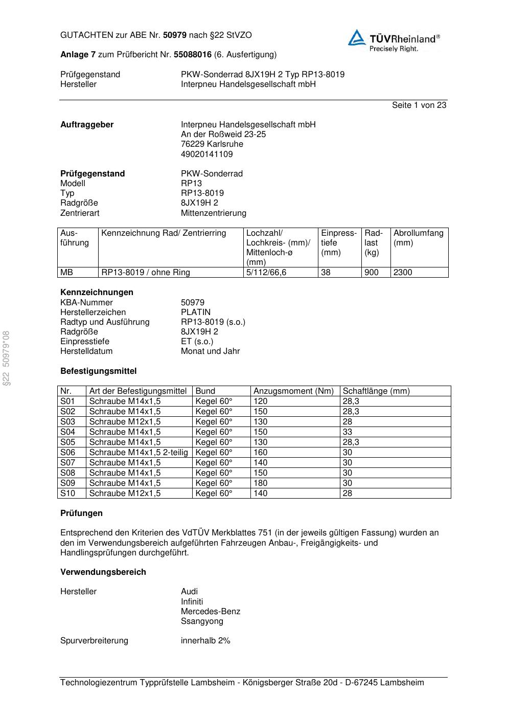 Dieses Gutachten (abe) bezieht sich auf die Alufelge Platin RP13-8019 in der Ausführung ET 0, Mittenloch 0 mm (KBA 50979). Im PDF findest du typischerweise zulässige Reifengrößen, Auflagen/Anbauhinweise und – je nach Dokument – Hinweise zur Eintragung.