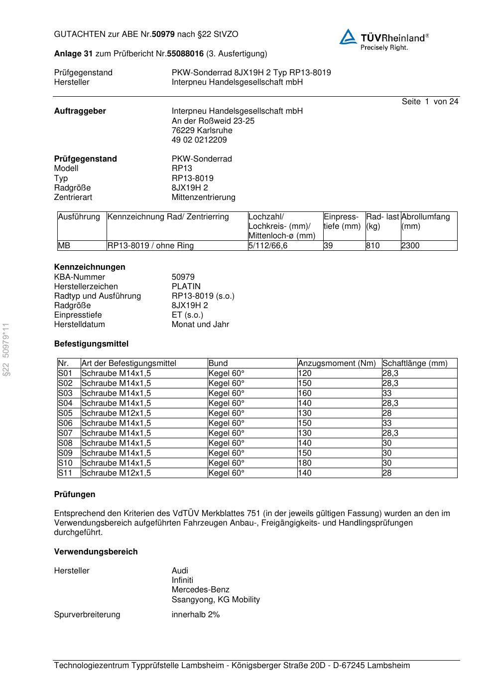 Dieses Gutachten (abe) bezieht sich auf die Alufelge Platin RP13-8019 in der Ausführung ET 0, Mittenloch 0 mm (KBA 50979). Im PDF findest du typischerweise zulässige Reifengrößen, Auflagen/Anbauhinweise und – je nach Dokument – Hinweise zur Eintragung.