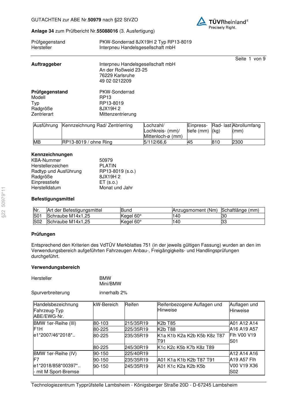 Dieses Gutachten (abe) bezieht sich auf die Alufelge Platin RP13-8019 in der Ausführung ET 0, Mittenloch 0 mm (KBA 50979). Im PDF findest du typischerweise zulässige Reifengrößen, Auflagen/Anbauhinweise und – je nach Dokument – Hinweise zur Eintragung.
