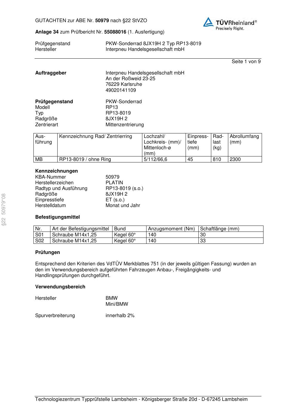 Dieses Gutachten (abe) bezieht sich auf die Alufelge Platin RP13-8019 in der Ausführung ET 0, Mittenloch 0 mm (KBA 50979). Im PDF findest du typischerweise zulässige Reifengrößen, Auflagen/Anbauhinweise und – je nach Dokument – Hinweise zur Eintragung.