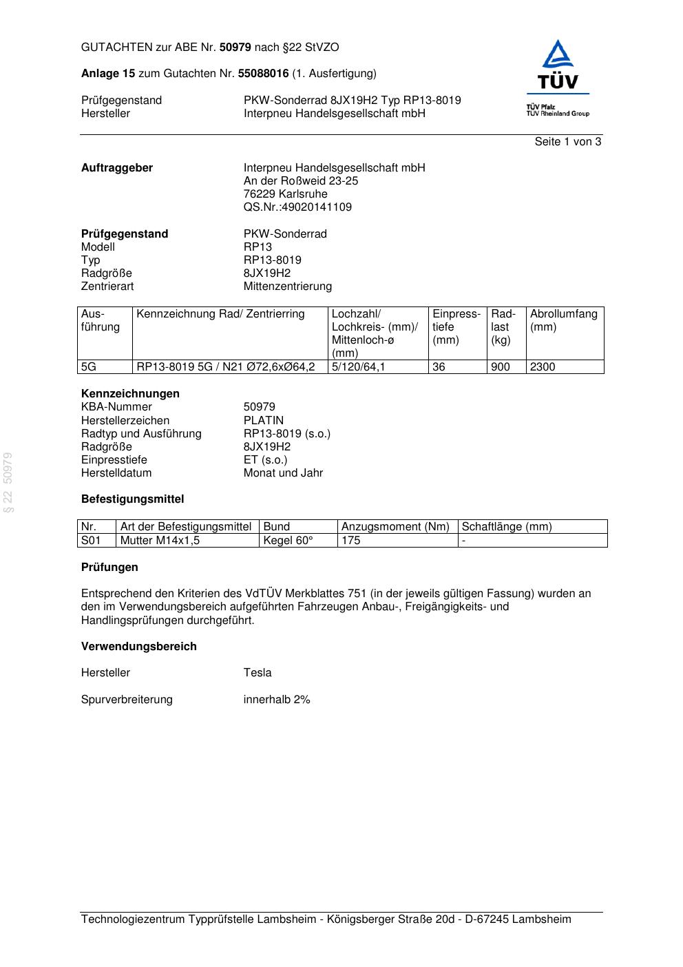 Dieses Gutachten (abe) bezieht sich auf die Alufelge Platin RP13-8019 in der Ausführung 8Jx19 ET 0, Mittenloch 0 mm (KBA 50979). Im PDF findest du typischerweise zulässige Reifengrößen, Auflagen/Anbauhinweise und – je nach Dokument – Hinweise zur Eintragung.