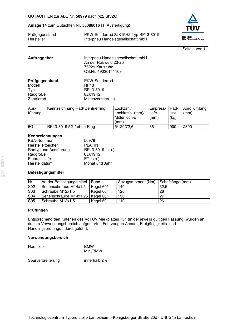Dieses Gutachten (abe) bezieht sich auf die Alufelge Platin RP13-8019 in der Ausführung 8Jx19 ET 0, Mittenloch 0 mm (KBA 50979). Im PDF findest du typischerweise zulässige Reifengrößen, Auflagen/Anbauhinweise und – je nach Dokument – Hinweise zur Eintragung.