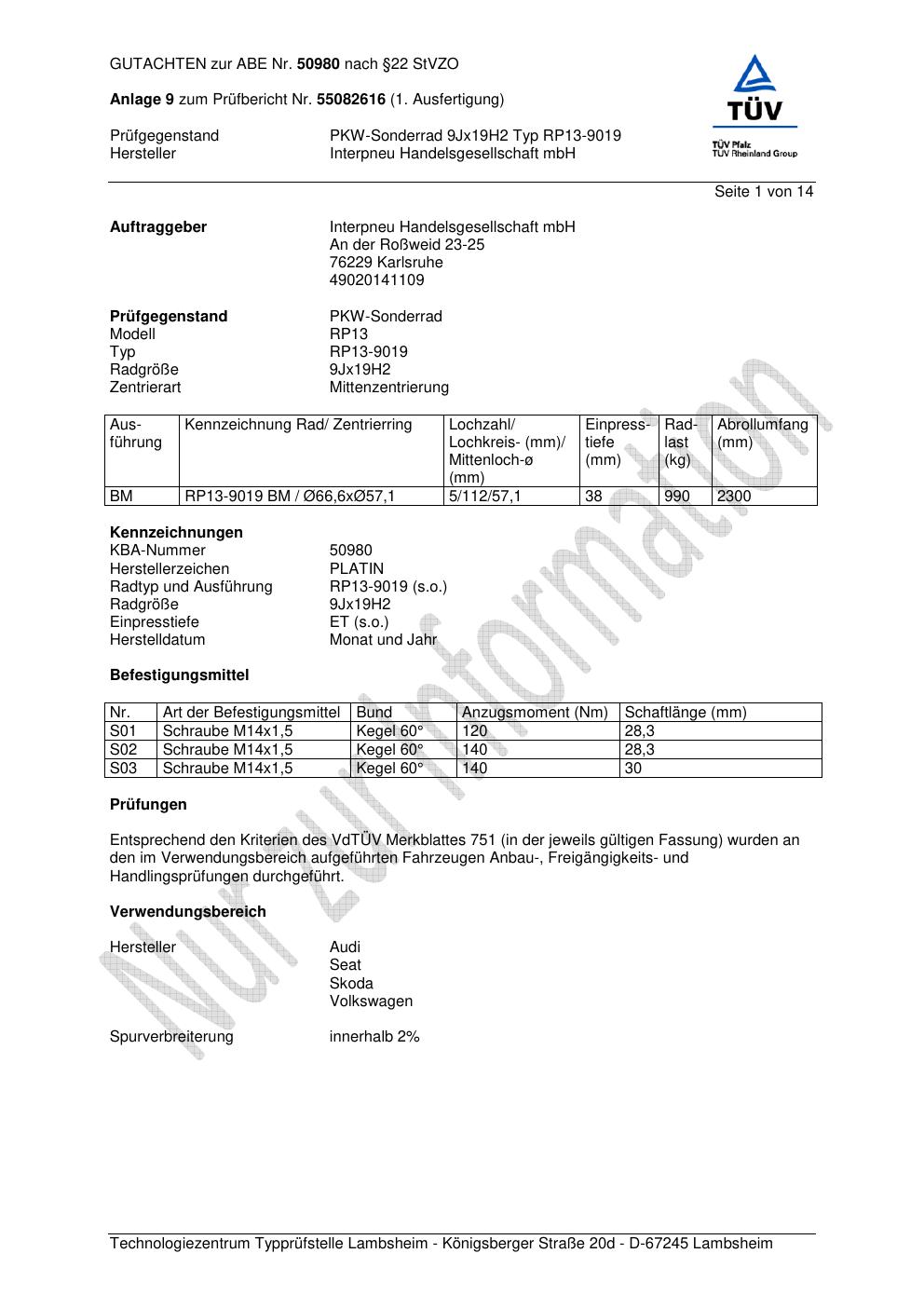 Dieses Gutachten (abe) bezieht sich auf die Alufelge Platin RP13-9019 in der Ausführung 9Jx19 ET 0, Mittenloch 0 mm (KBA 50980). Im PDF findest du typischerweise zulässige Reifengrößen, Auflagen/Anbauhinweise und – je nach Dokument – Hinweise zur Eintragung.