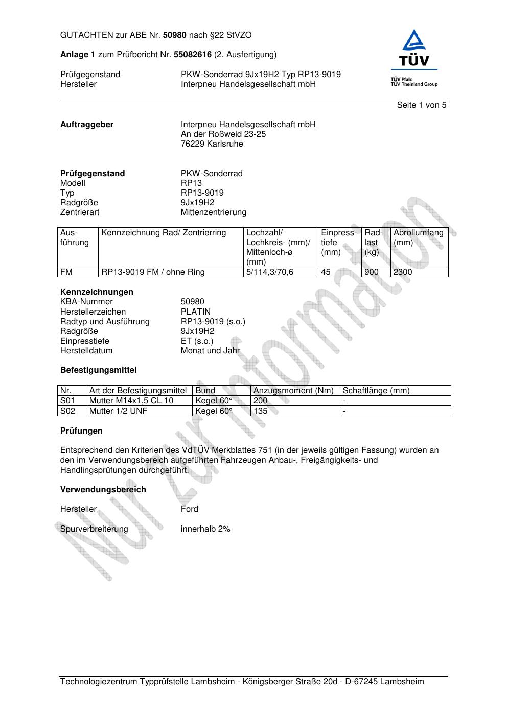 Felgengutachten / abe für Alufelgen Platin RP13-9019 (9Jx19 ET 0, Mittenloch 0 mm) mit KBA 50980 (Zertifikatsnummer 50980). Hier kostenlos als PDF herunterladen. Der Download-Link ist 24 Stunden gültig und kann bis zu zwei Mal verwendet werden.