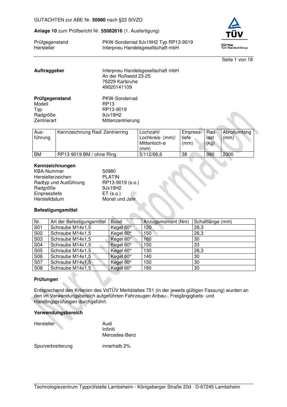 Dieses Gutachten (abe) bezieht sich auf die Alufelge Platin RP13-9019 in der Ausführung 9Jx19 ET 0, Mittenloch 0 mm (KBA 50980). Im PDF findest du typischerweise zulässige Reifengrößen, Auflagen/Anbauhinweise und – je nach Dokument – Hinweise zur Eintragung.