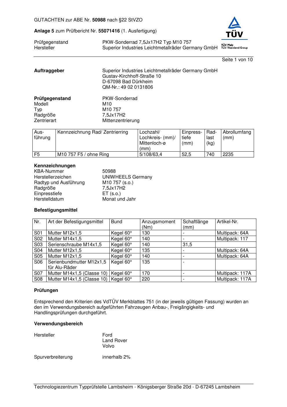 Dieses Gutachten (abe) bezieht sich auf die Alufelge Superior M10 757 in der Ausführung 7.5Jx17 ET 0, Mittenloch 0 mm (KBA 50988). Im PDF findest du typischerweise zulässige Reifengrößen, Auflagen/Anbauhinweise und – je nach Dokument – Hinweise zur Eintragung.